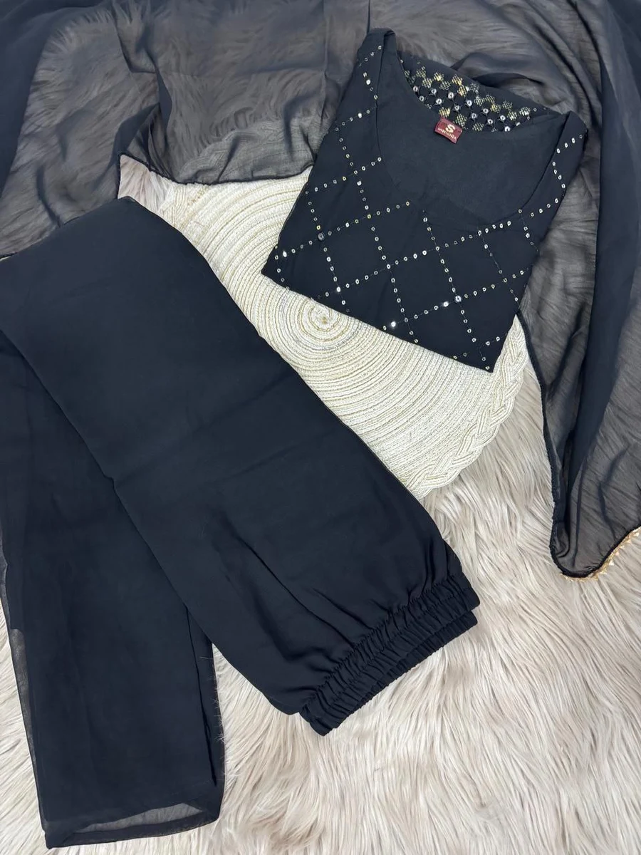 PALAZZO FABRIC :- HEAVY FAUX GEORGETTE WITH 5MM EMBROIDERY SEQUENCE WITH FULLY FLAIR