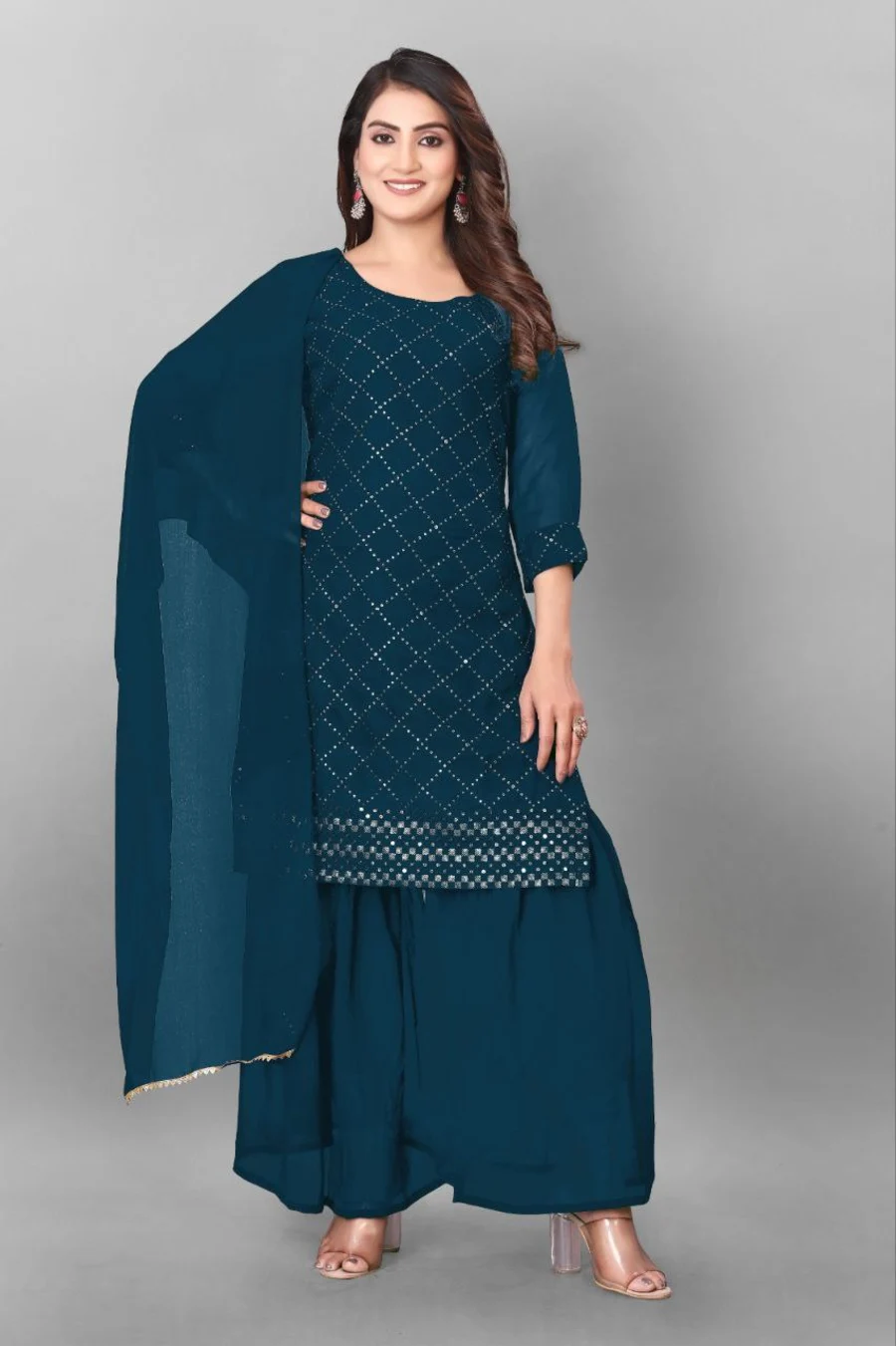 MODERN GEORGETTE EMBROIDERY WORK TOPM PALAZZO WITH DUPATTA TEAL
