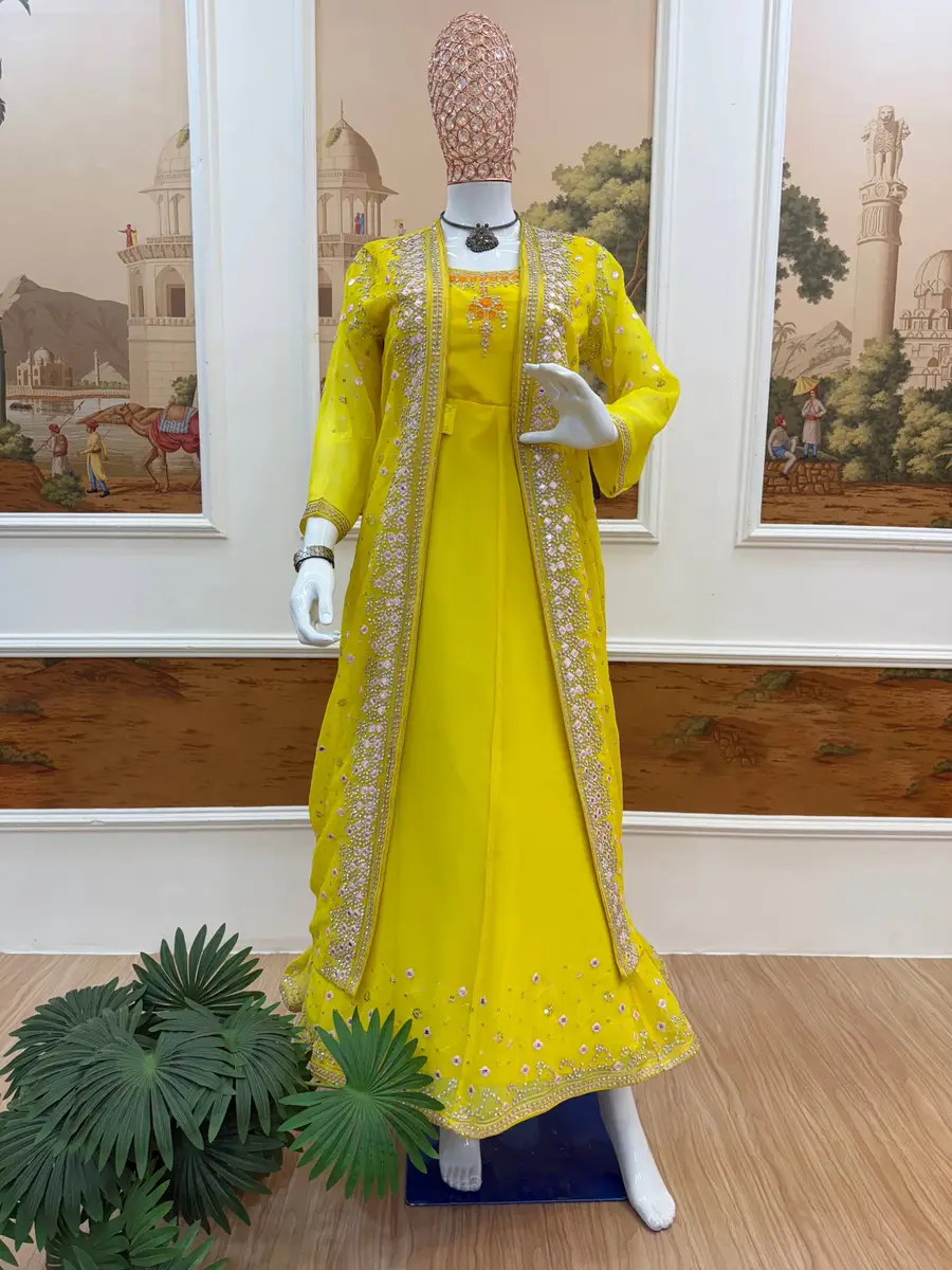 MODERN GEORGETTE EMBROIDERY WORK WITH CRYSTAL DIAMOND WORK GOWN KOTI WITH DUPATTA LEMON