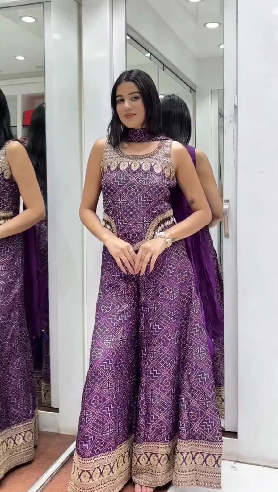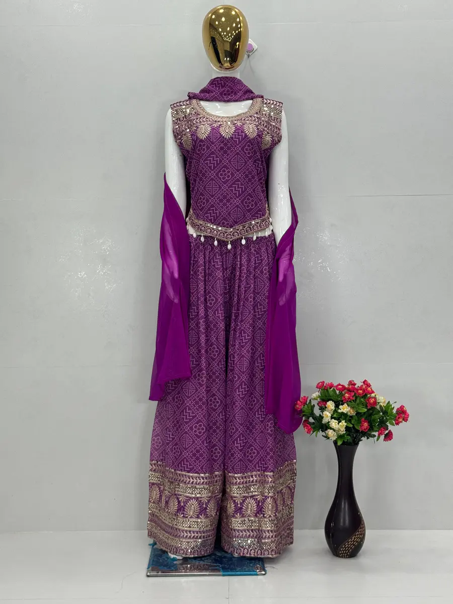 MODERN GEORGETTE FANCY DIGITAL PRINT WITH EMBROIDERY SEQUENCE AND LACE WORK TOP PALAZZO WITH DUPATTA PURPLE