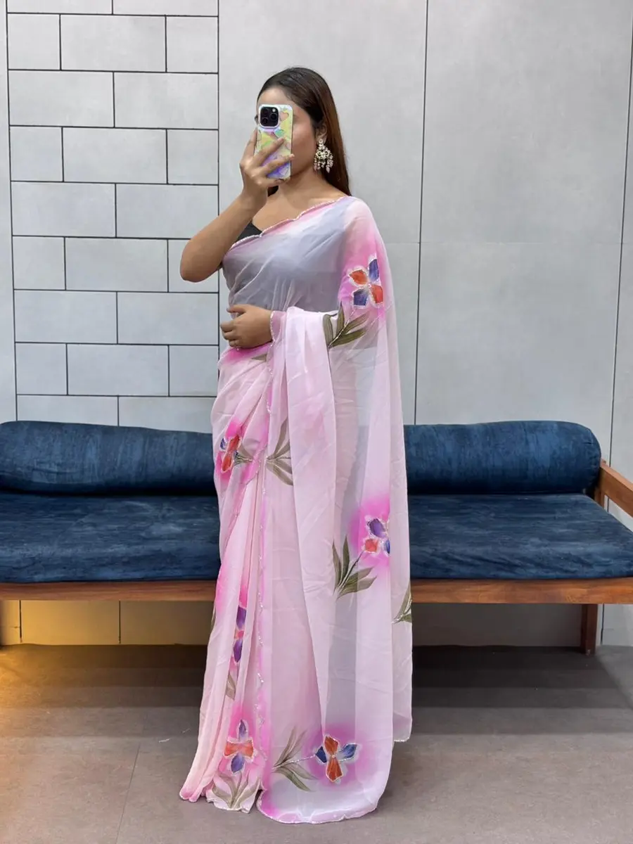 MODERN GEORGETTE HANDPAINT FLOWER PRINT PANEL WORK WITH CUT DANA HANDWORK SAREE WITH UNSTITCHED BLOUSE PINK