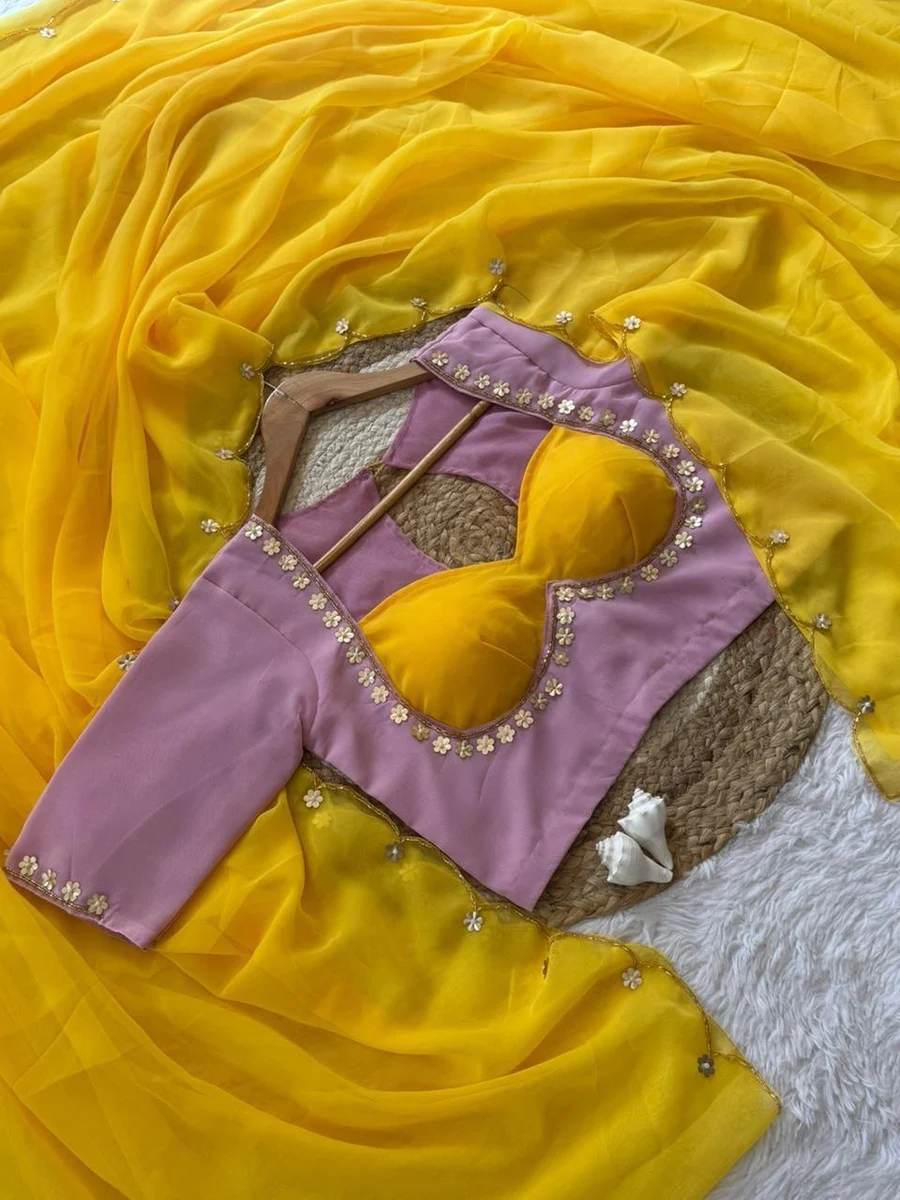 MODERN GEORGETTE HANDWORK KHATALI CUT DANA WITH MOTI & SMALL FLOWER BORDER WORK SAREE WITH STITCHED BLOUSE YELLOW