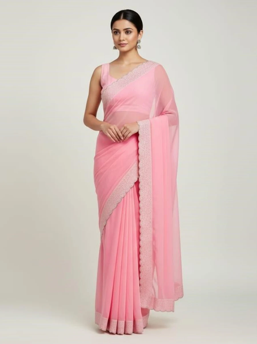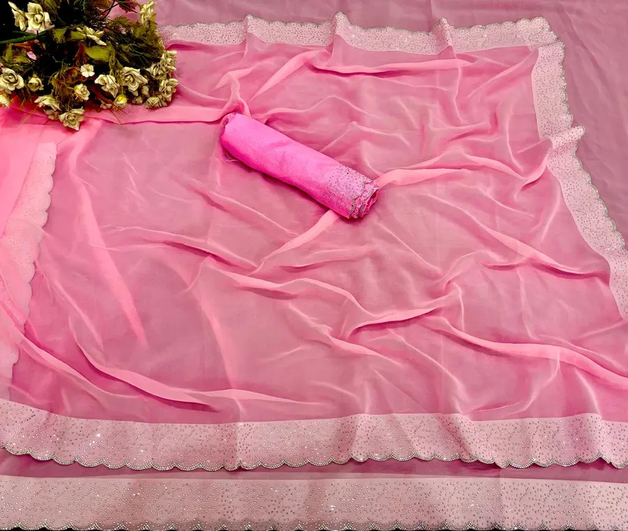 MODERN GEORGETTE HOTFIX WORK SAREE WITH UNSTITCHED BLOUSE BABY PINK