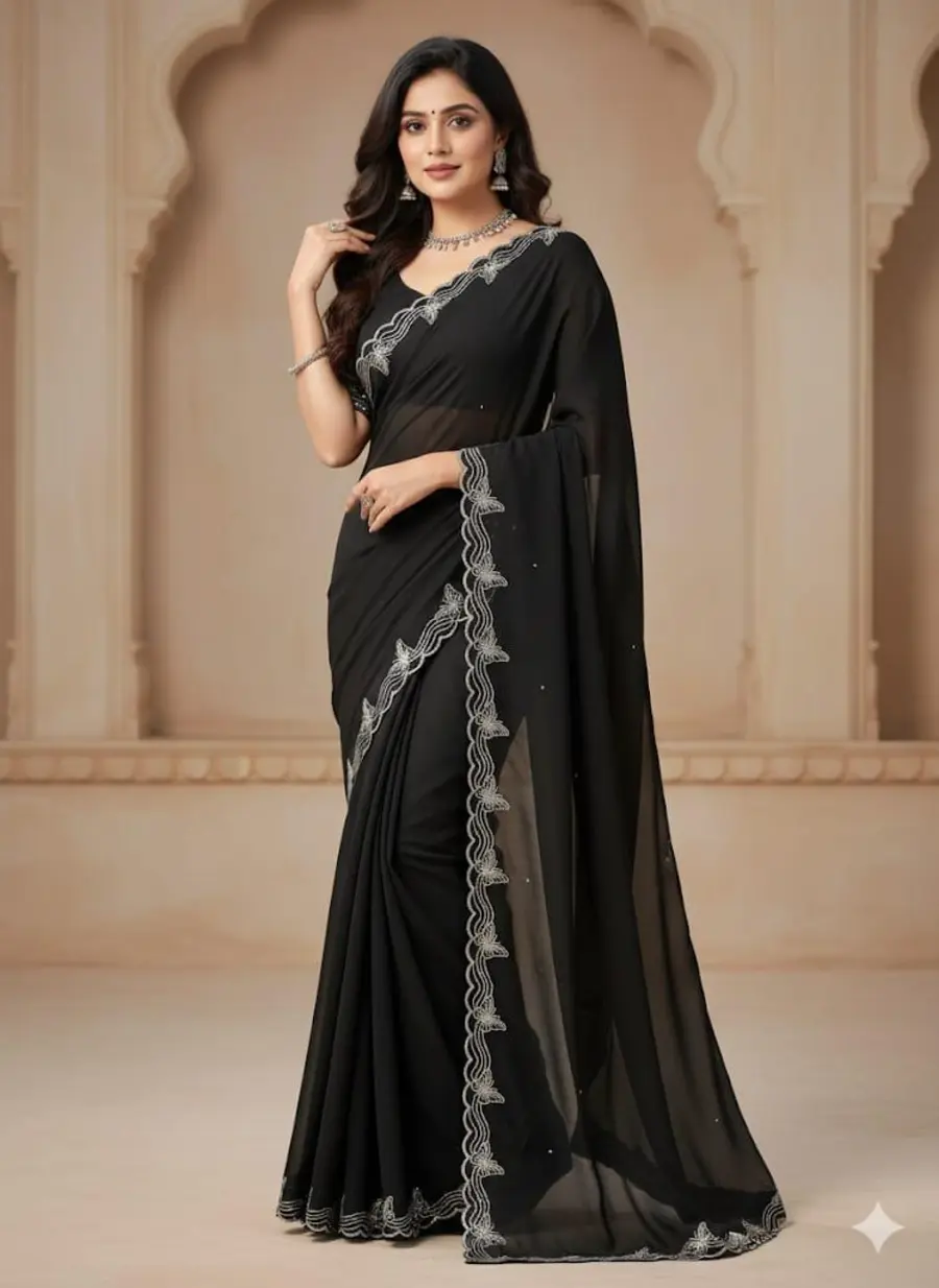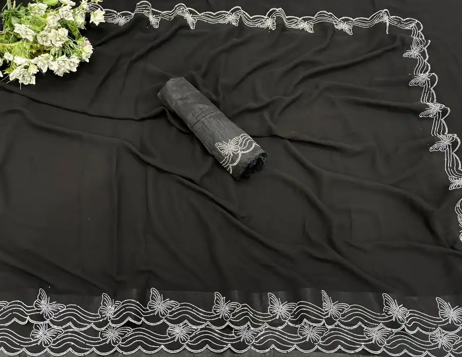 MODERN GEORGETTE HOTFIX WORK SAREE WITH UNSTITCHED BLOUSE BLACK