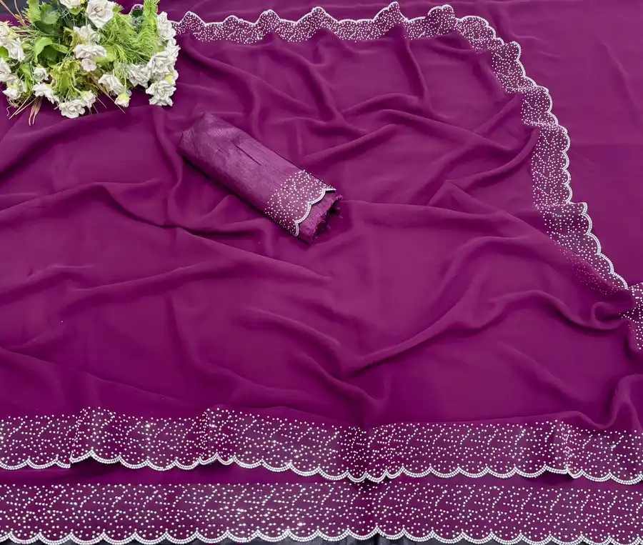 MODERN GEORGETTE HOTFIX WORK SAREE WITH UNSTITCHED BLOUSE WINE