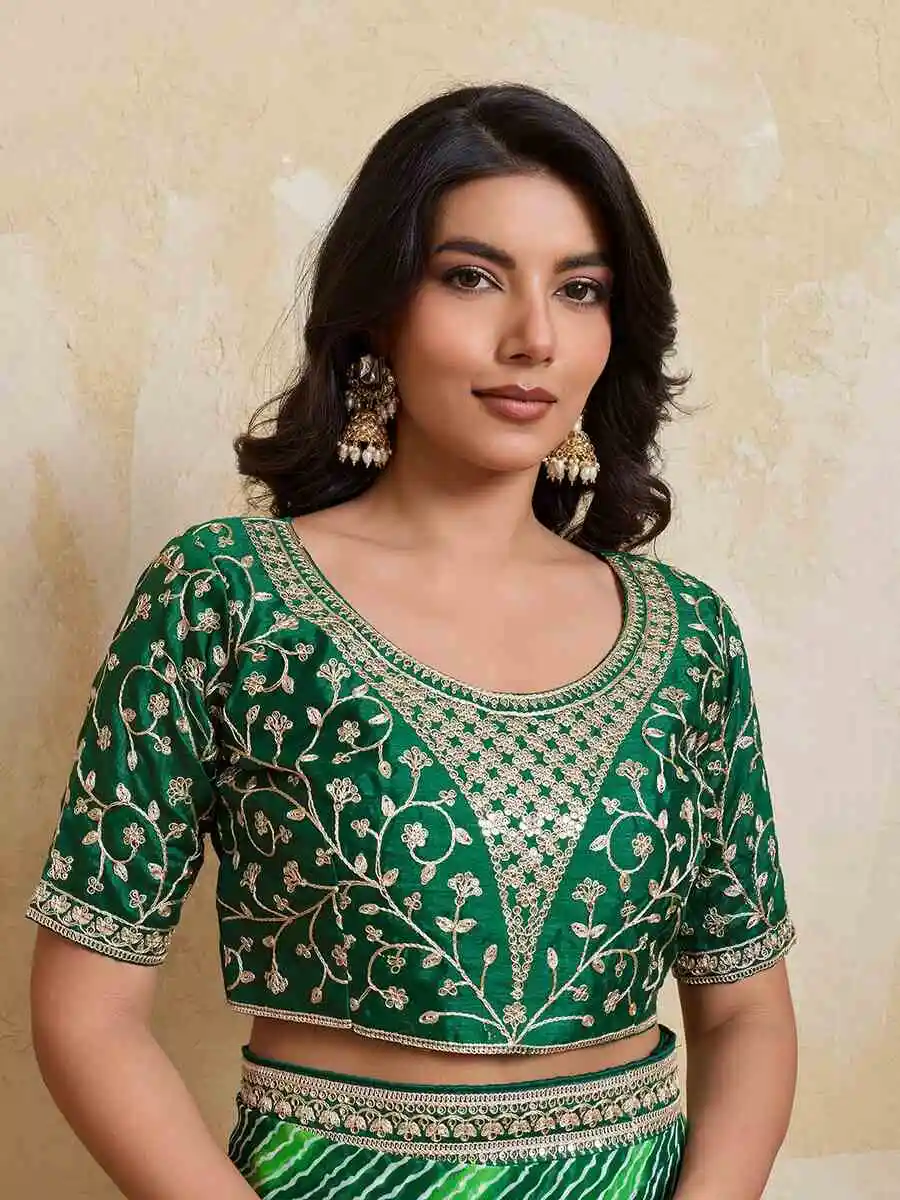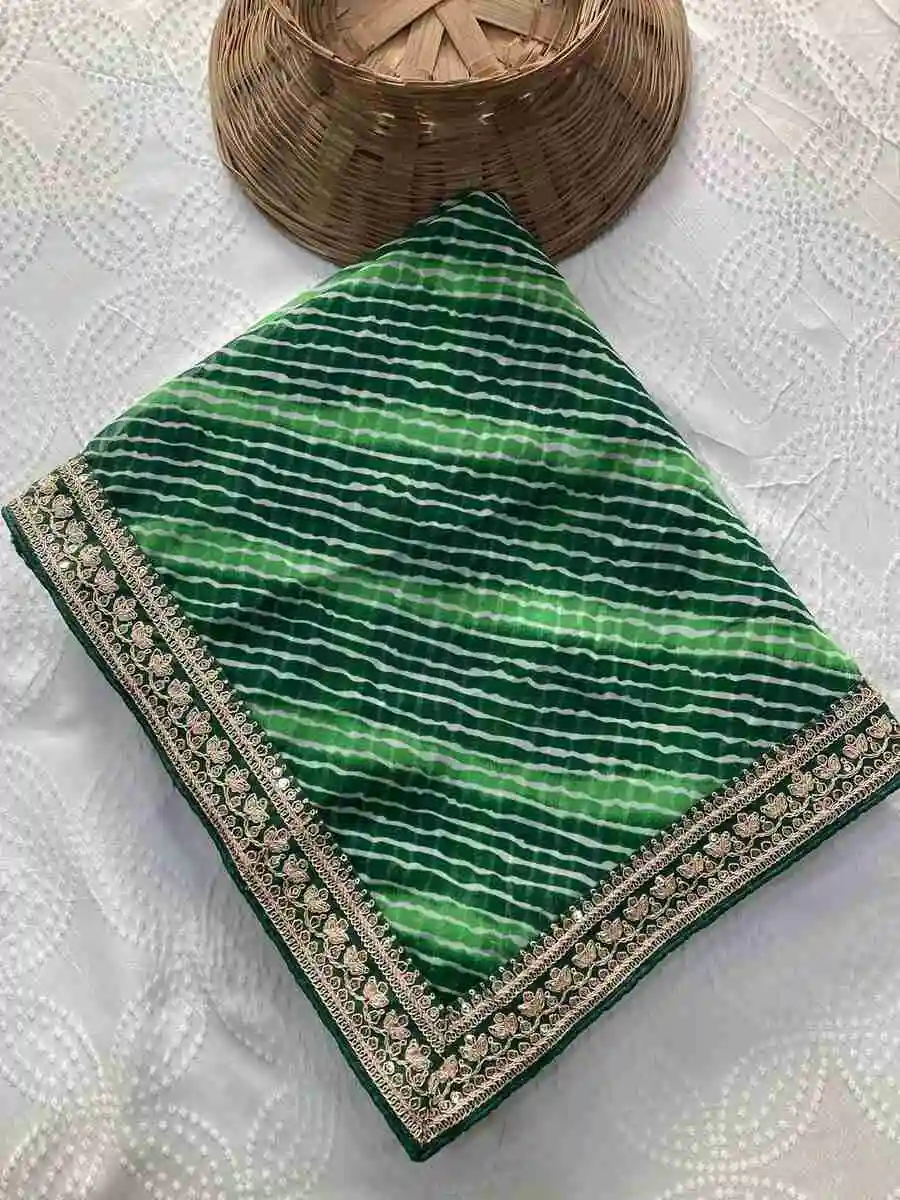 MODERN GEORGETTE LAHERIYA BANDHEJ PRINT WITH LACE BORDER WORK SAREE WITH UNSTITCHED BLOUSE GREEN