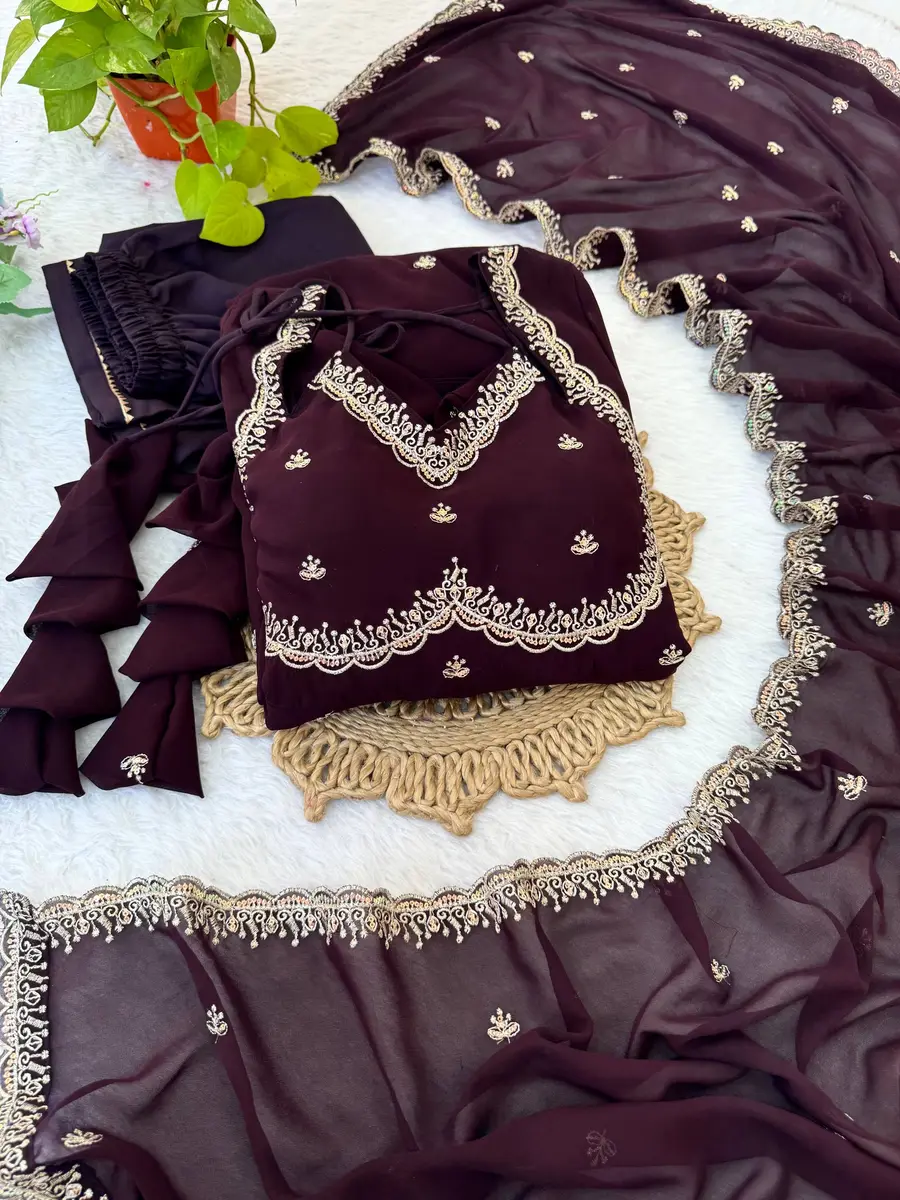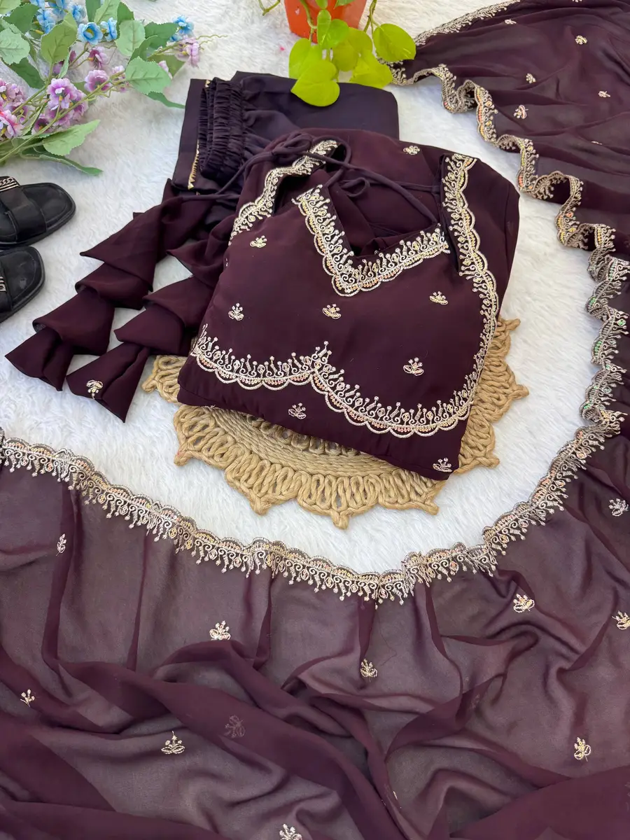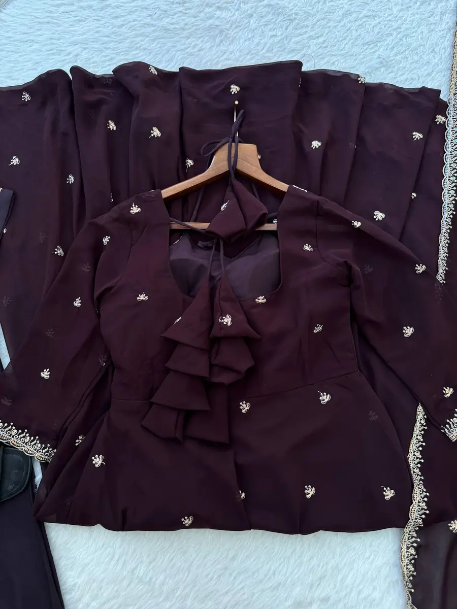 MODERN GEORGETTE RAMBO SEQUENCE EMBROIDERY WORK GOWN BOTTOM WITH DUPATTA COFFEE