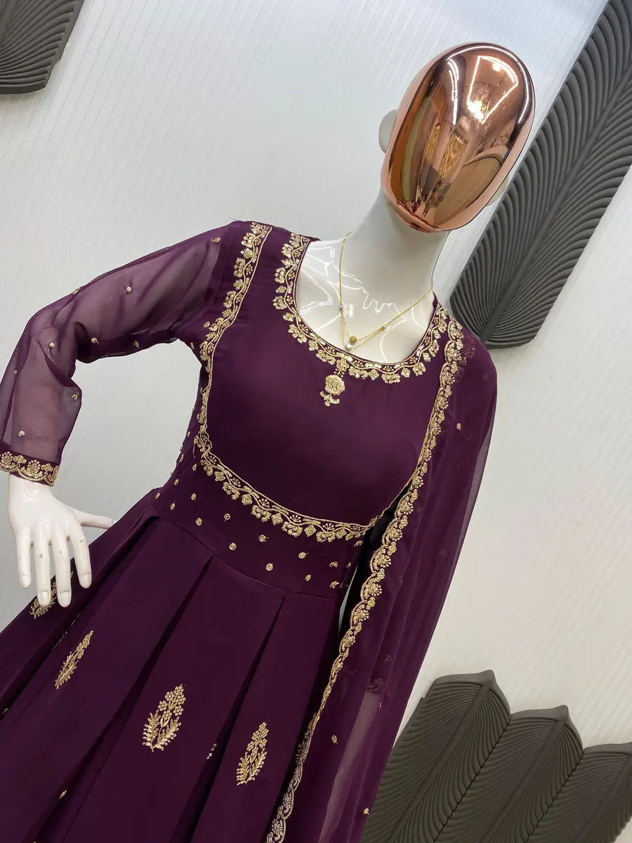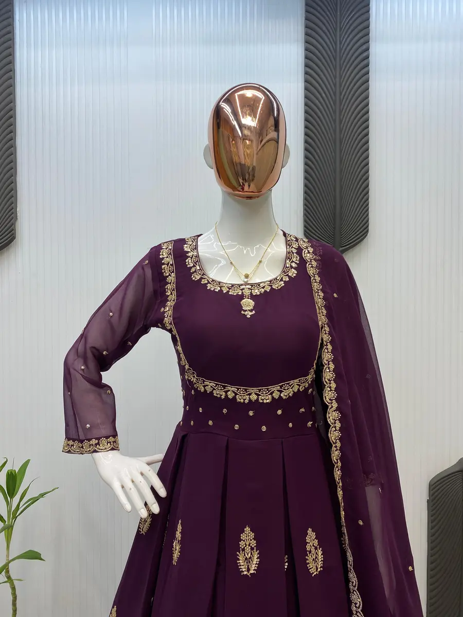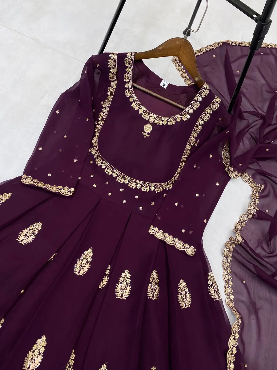 MODERN GEORGETTE SEQUENCE EMBROIDERY WORK GOWN WITH DUPATTA WINE