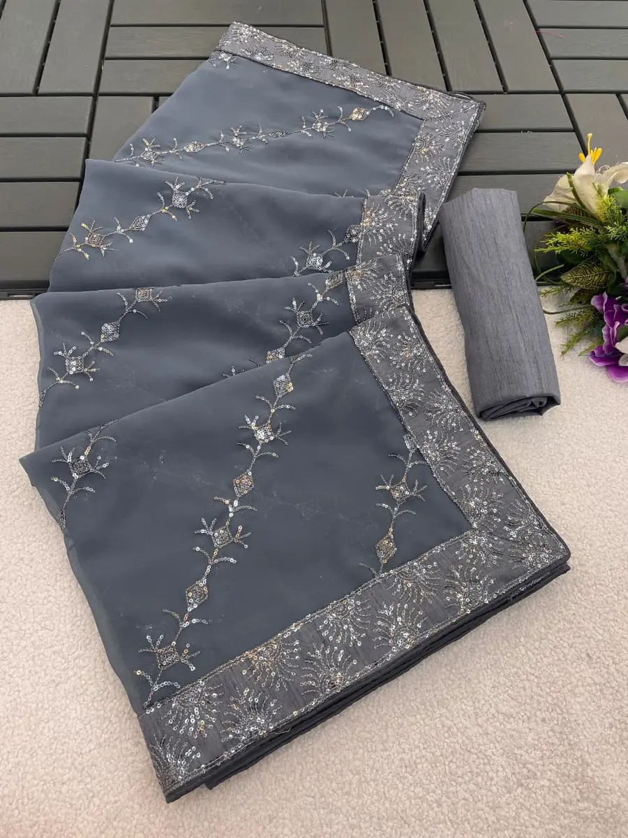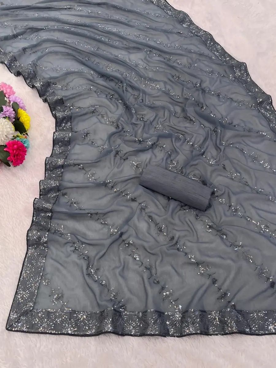 MODERN GEORGETTE SILK SEQUENCE WORK ALL OVER WITH PIPING BORDER WORK SAREE WITH UNSTITCHED BLOUSE GREY