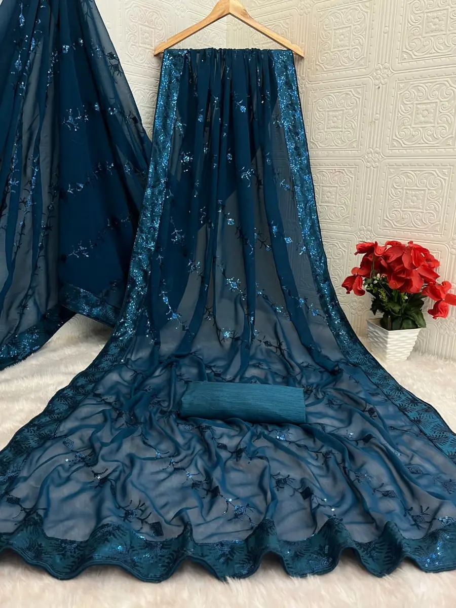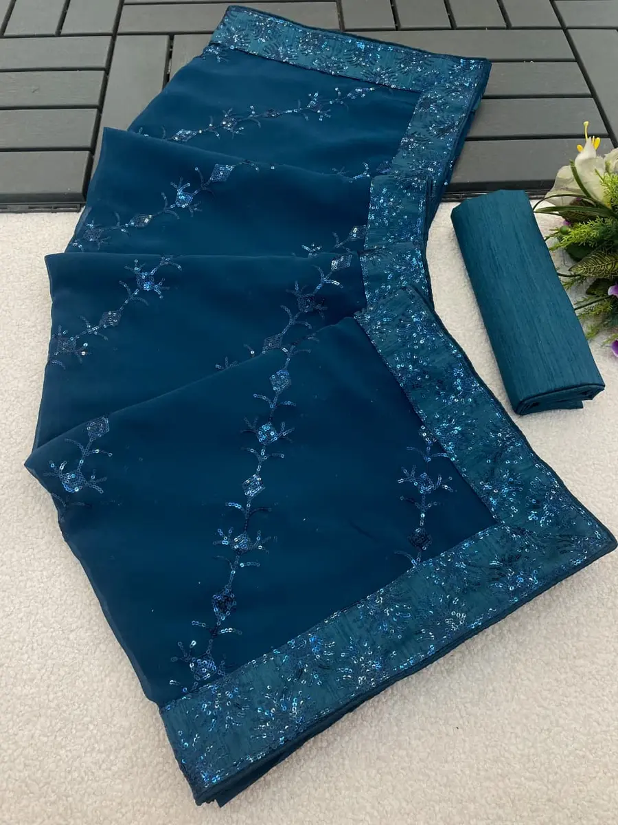 MODERN GEORGETTE SILK SEQUENCE WORK ALL OVER WITH PIPING BORDER WORK SAREE WITH UNSTITCHED BLOUSE TEAL