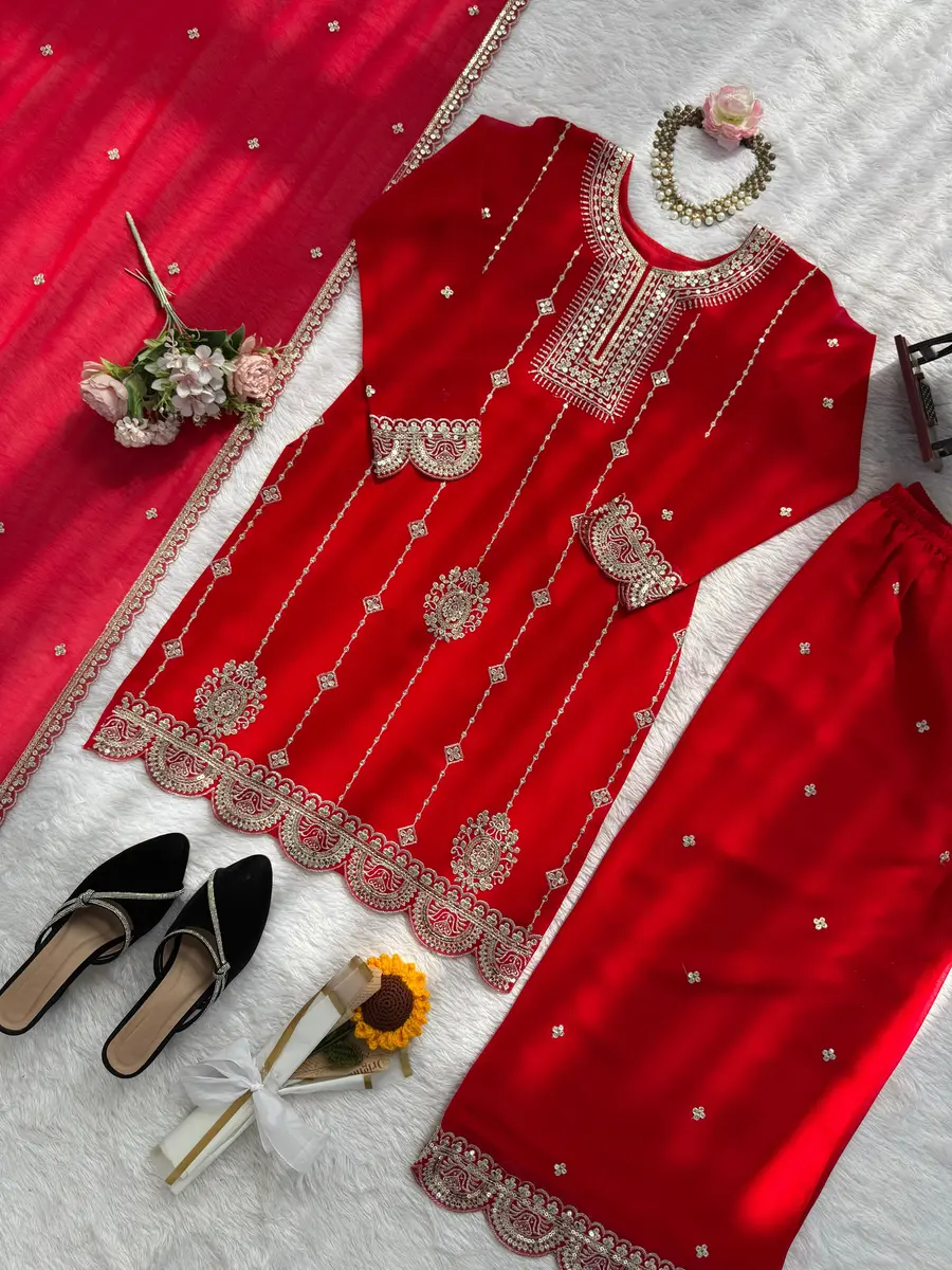 MODERN GEORGETTE THREAD WITH SEQUENCE WORK TOP PALAZZO WITH DUPATTA RED