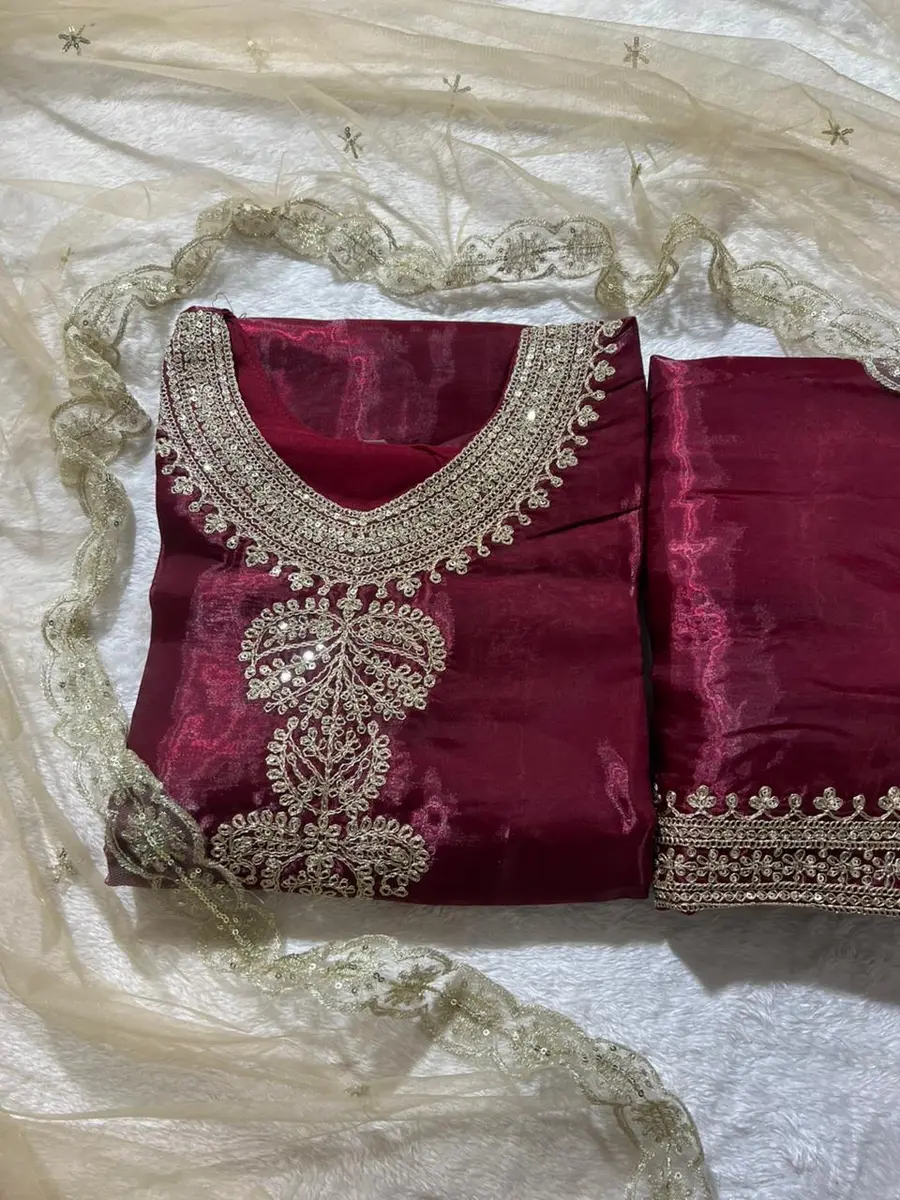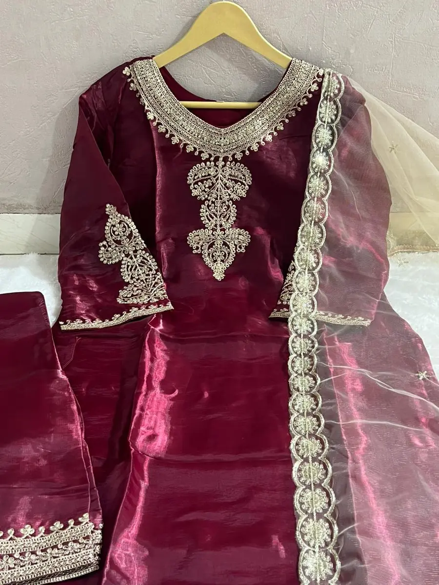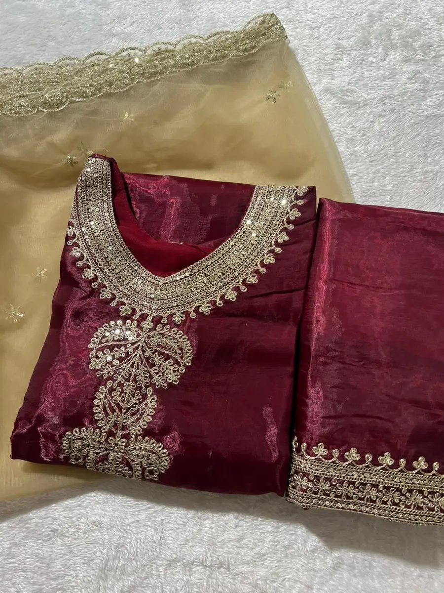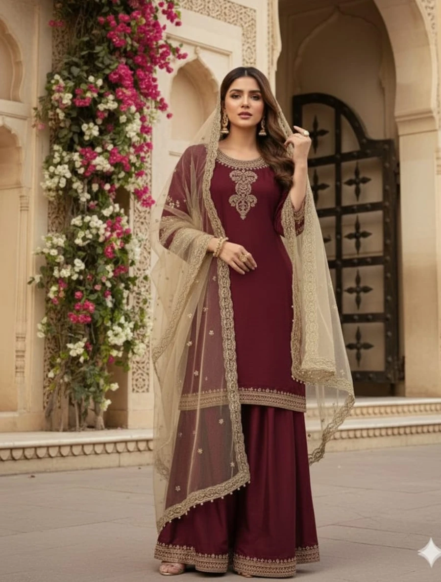MODERN GMY SILK EMBROIDERY WORK TOP BOTTOM WITH DUPATTA MAROON