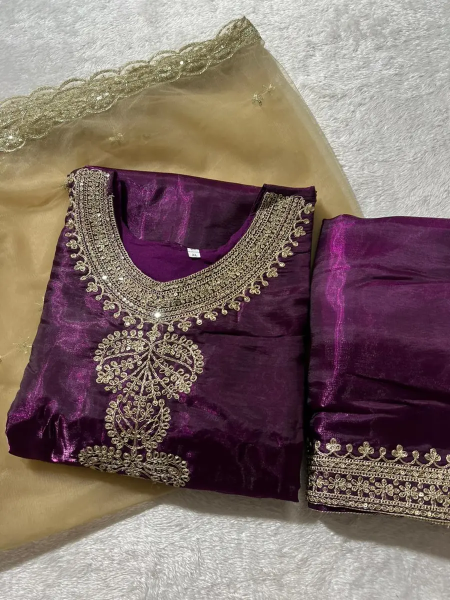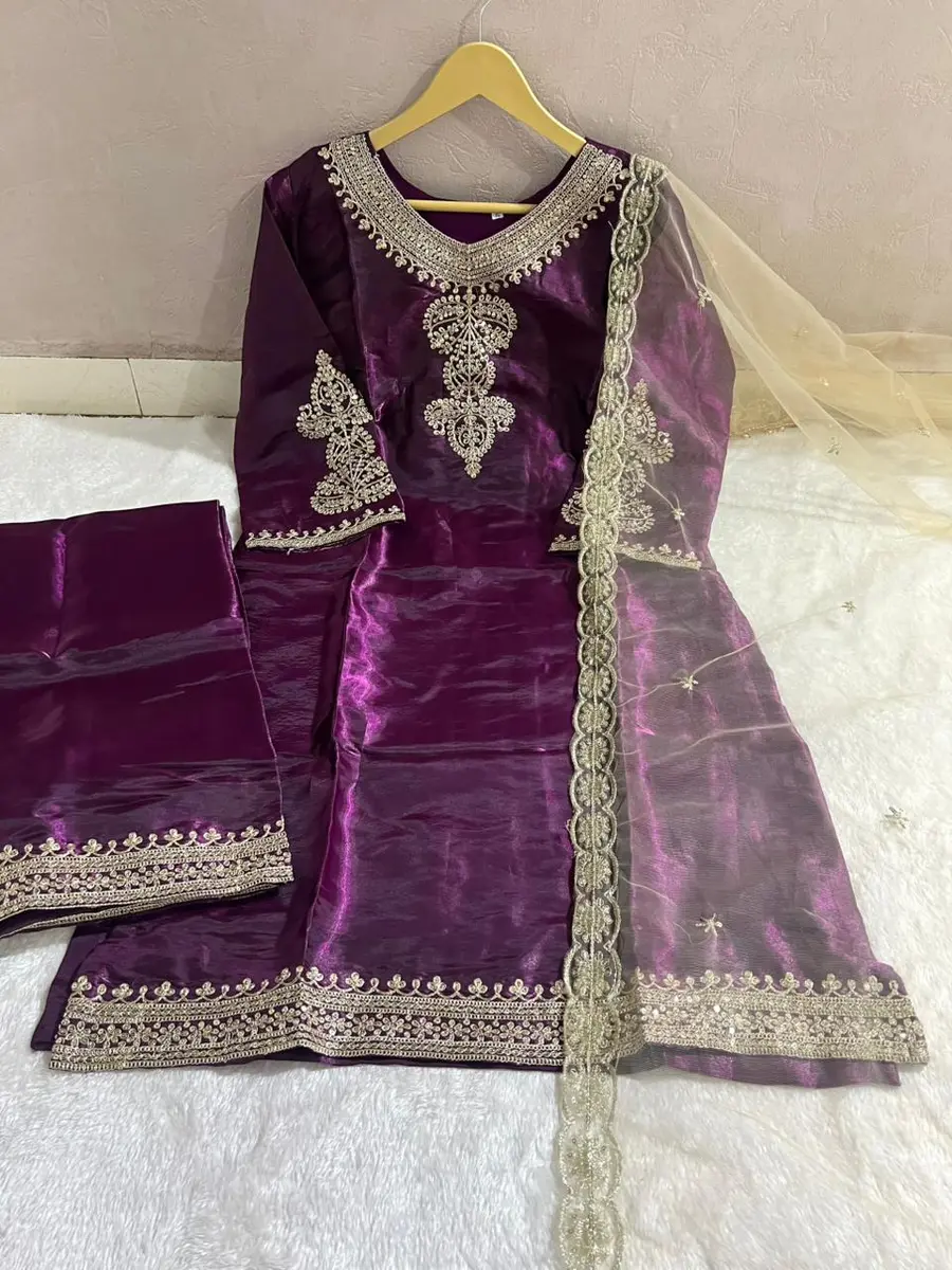 MODERN GMY SILK EMBROIDERY WORK TOP BOTTOM WITH DUPATTA PURPLE