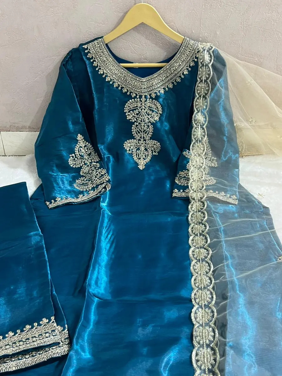 MODERN GMY SILK EMBROIDERY WORK TOP BOTTOM WITH DUPATTA TEAL