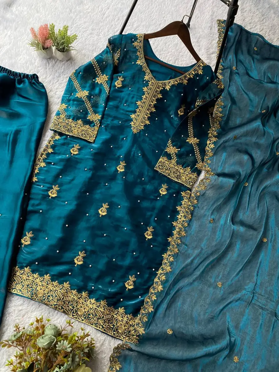 MODERN GMY SILK SEQUENCE EMBROIDERY WITH BEADS WORK TOP PALAZZO WITH DUPATTA TEAL