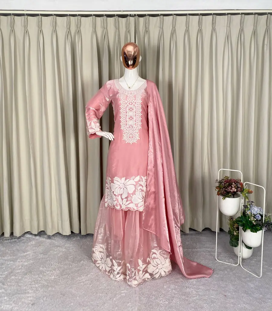MODERN GMY SILK SEQUENCE EMBROIDERY WORK TOP SHARARA WITH DUPATTA BABY PINK