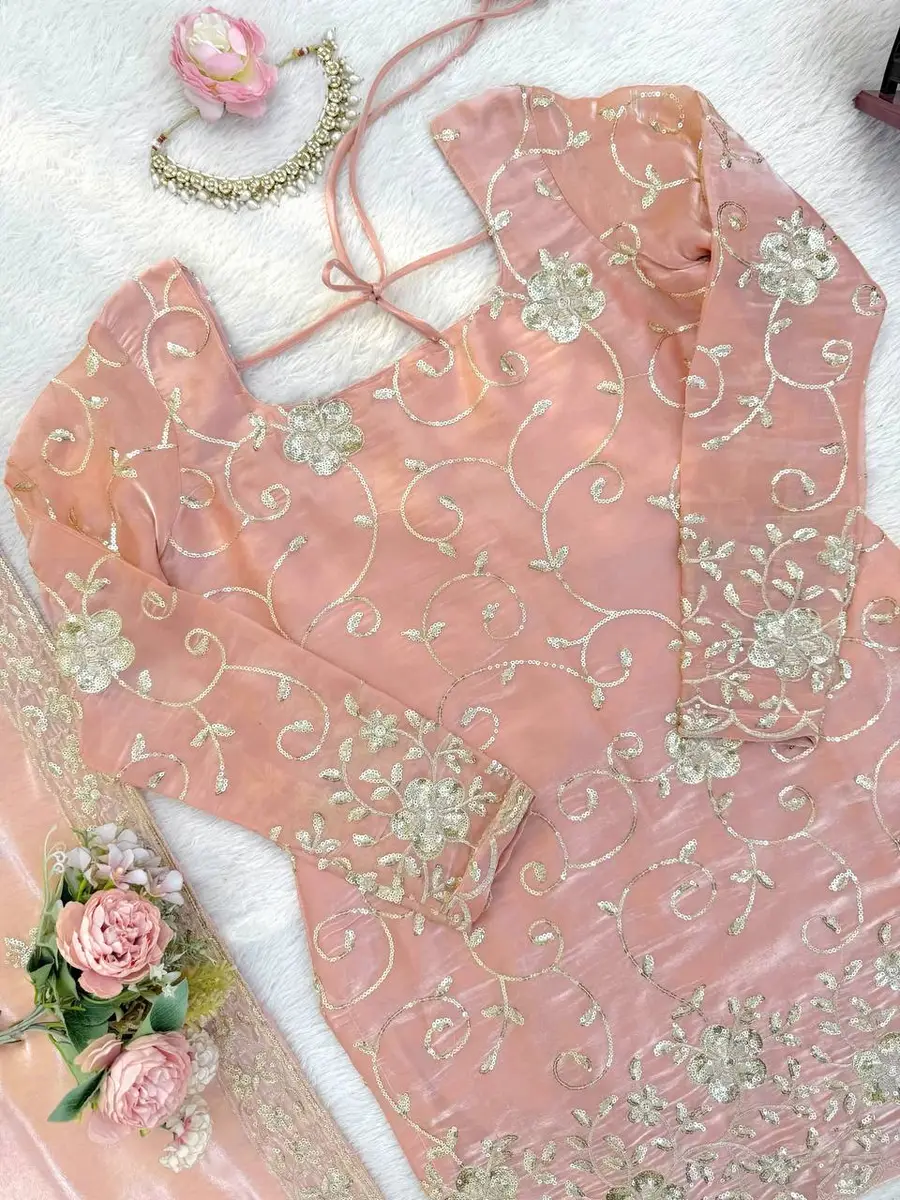 TOP FABRIC :- PURE HEAVY CHINON SILK WITH EMBROIDERY AND 5MM SEQUENCE WORK WITH FULL SLEEVES