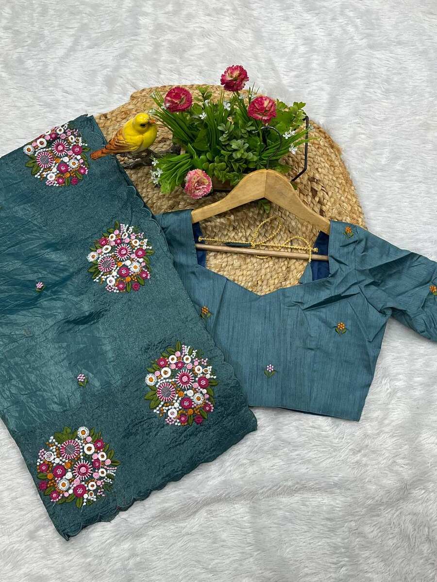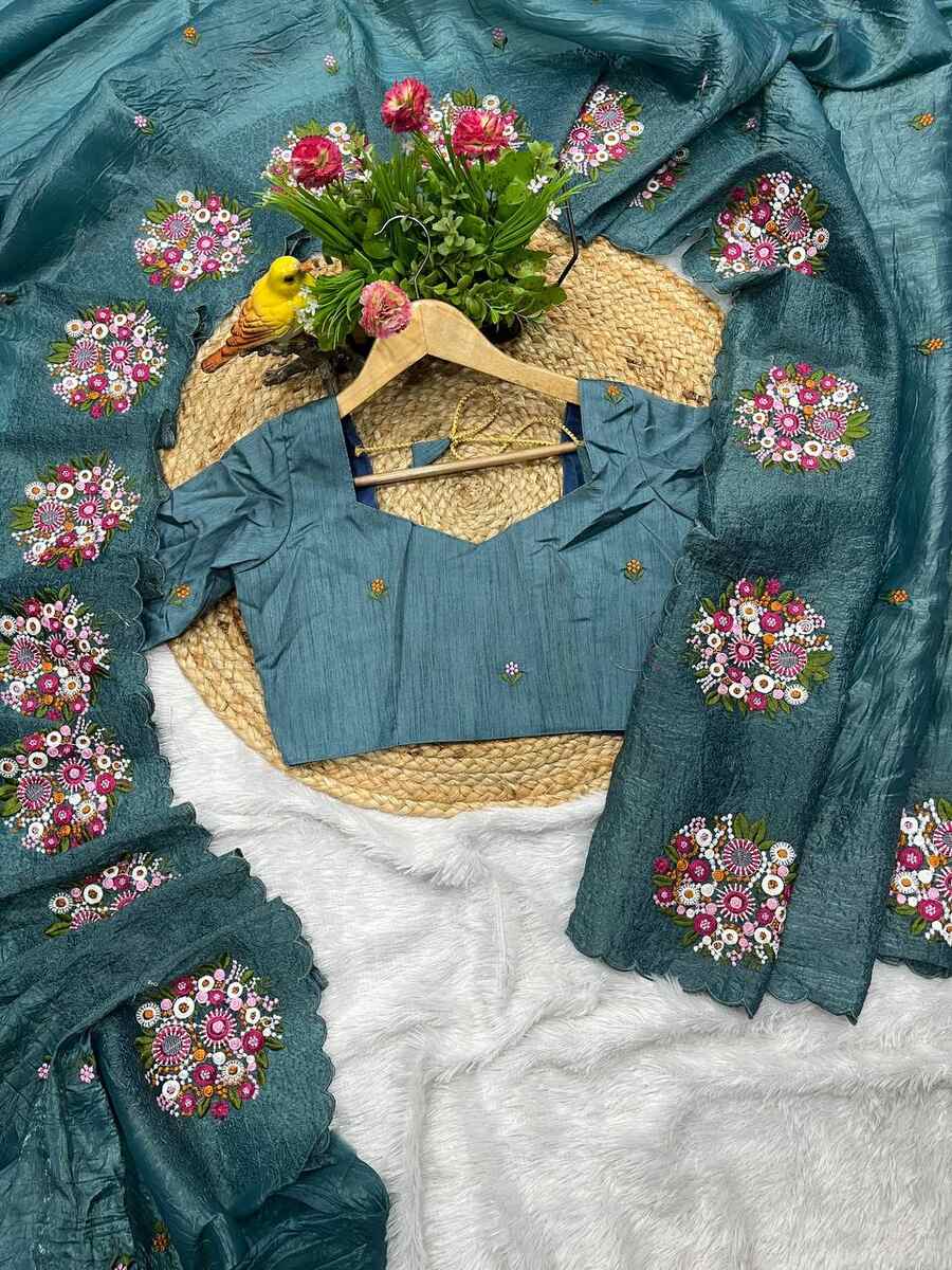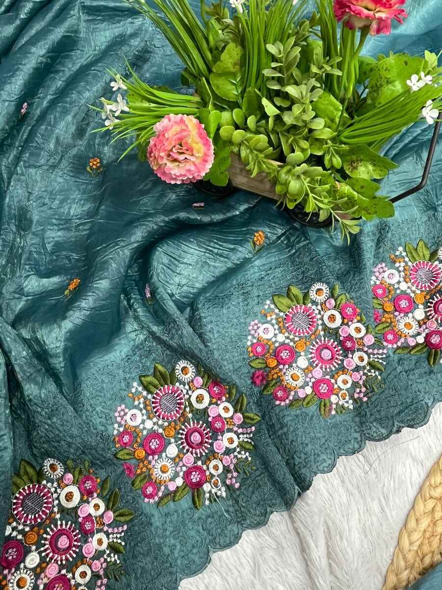 MODERN GOLD CRUSH MULTI COLOR THREAD WORK SAREE WITH UNSTITCHED BLOUSE BLUE