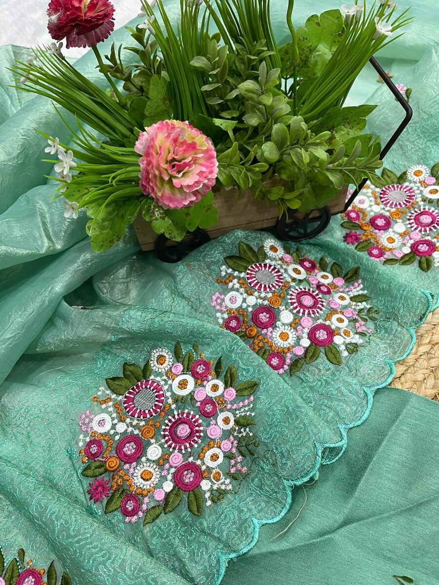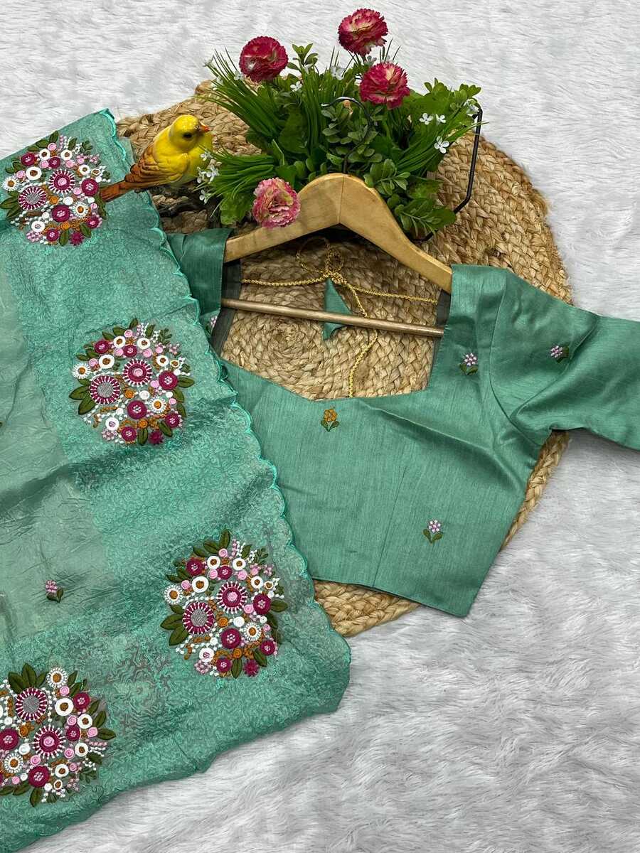 SAREE FABRIC : PURE SOFT TABBY ORGANZA WITH HEAVY EMBROIDERY MULTI TREADS , CODING & SEQUENCE WORK & FANCY CUT WORK BORDER