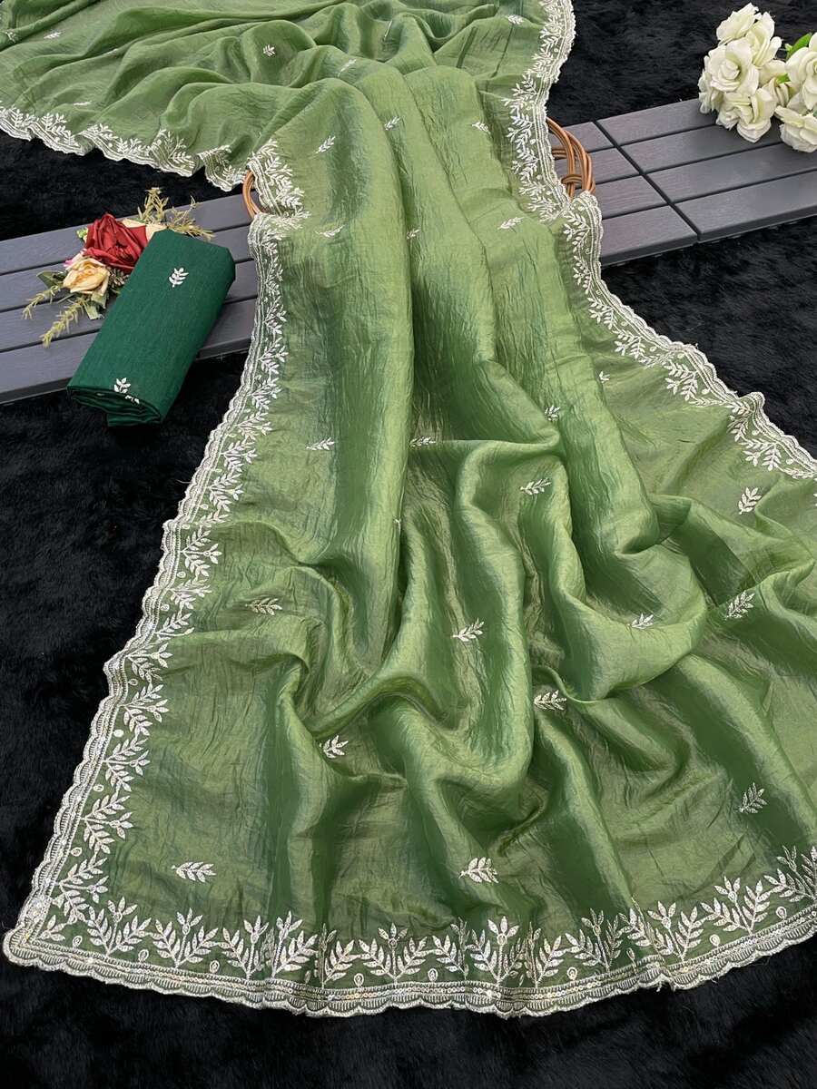 SAREE FABRIC : PREMIUM DIAMOND CHINON SILK WITH HEAVY EMBROIDERY CODING MULTI TREADS AND SEQUENCE WORK