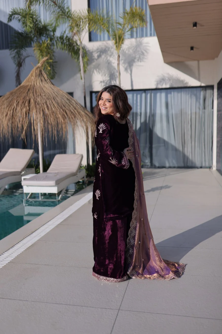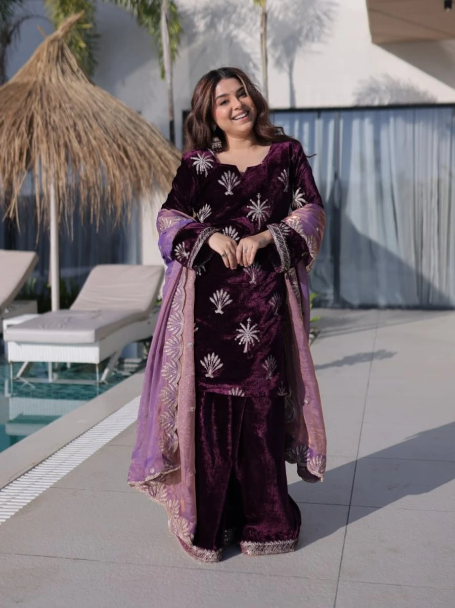 MODERN ICE VELVET ZARI EMBROIDERY WORK TOP PALAZZO WITH DUPATTA PURPLE
