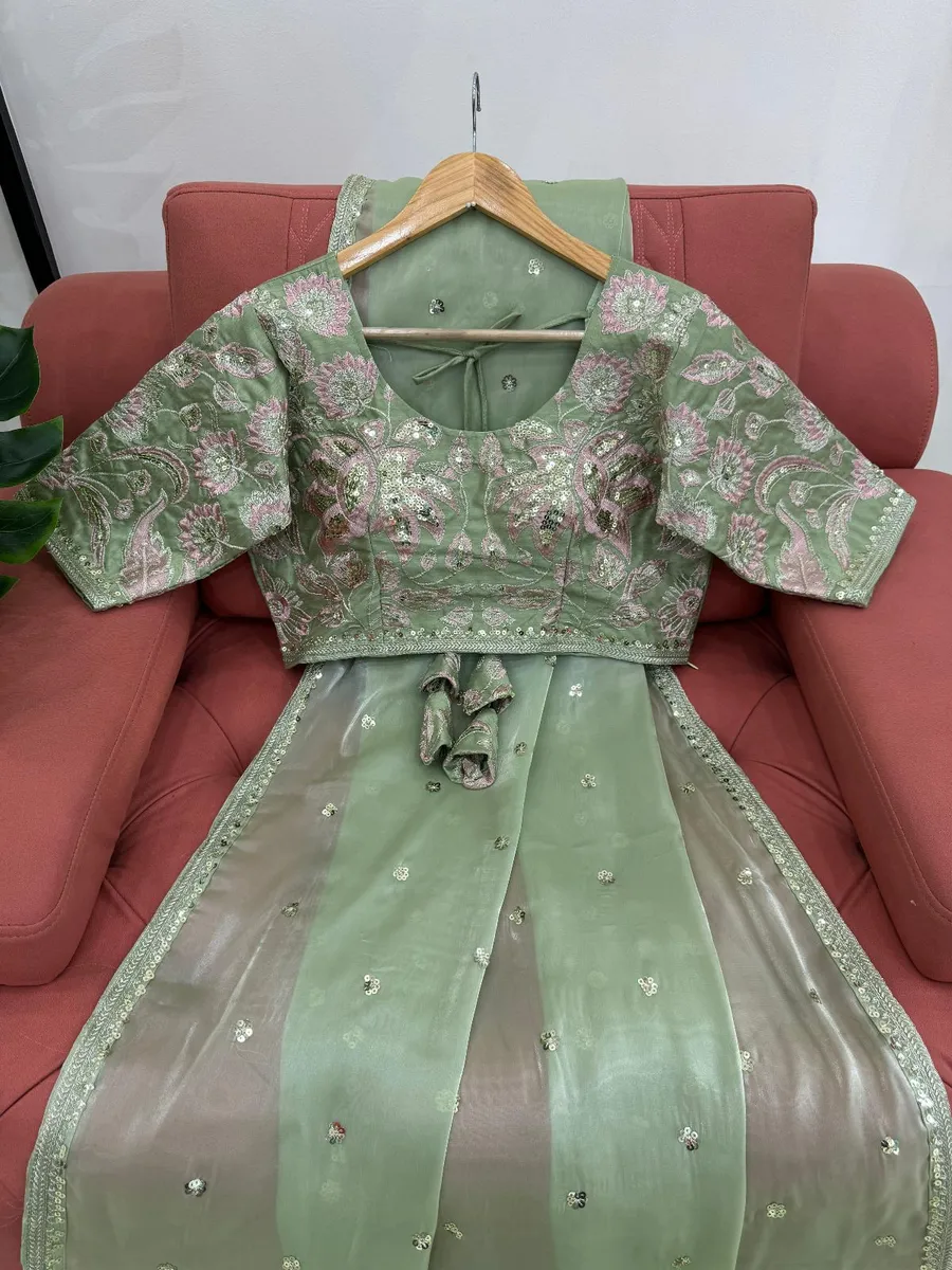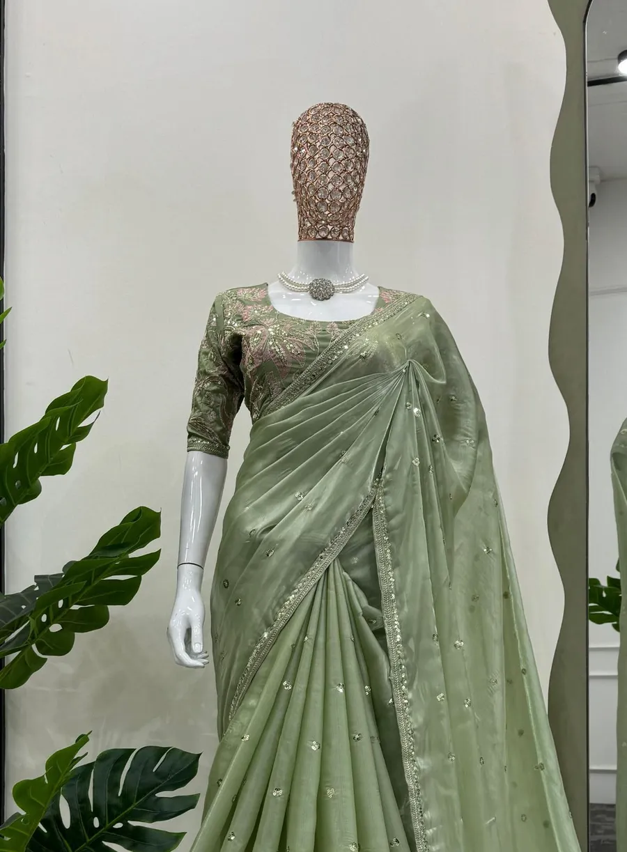 MODERN JC SILK EMBROIDERY ZARI AND SEQUENCE WORK WITH HEAVY WORK BORDER WORK SAREE WITH UNSTITCHED BLOUSE PISTA