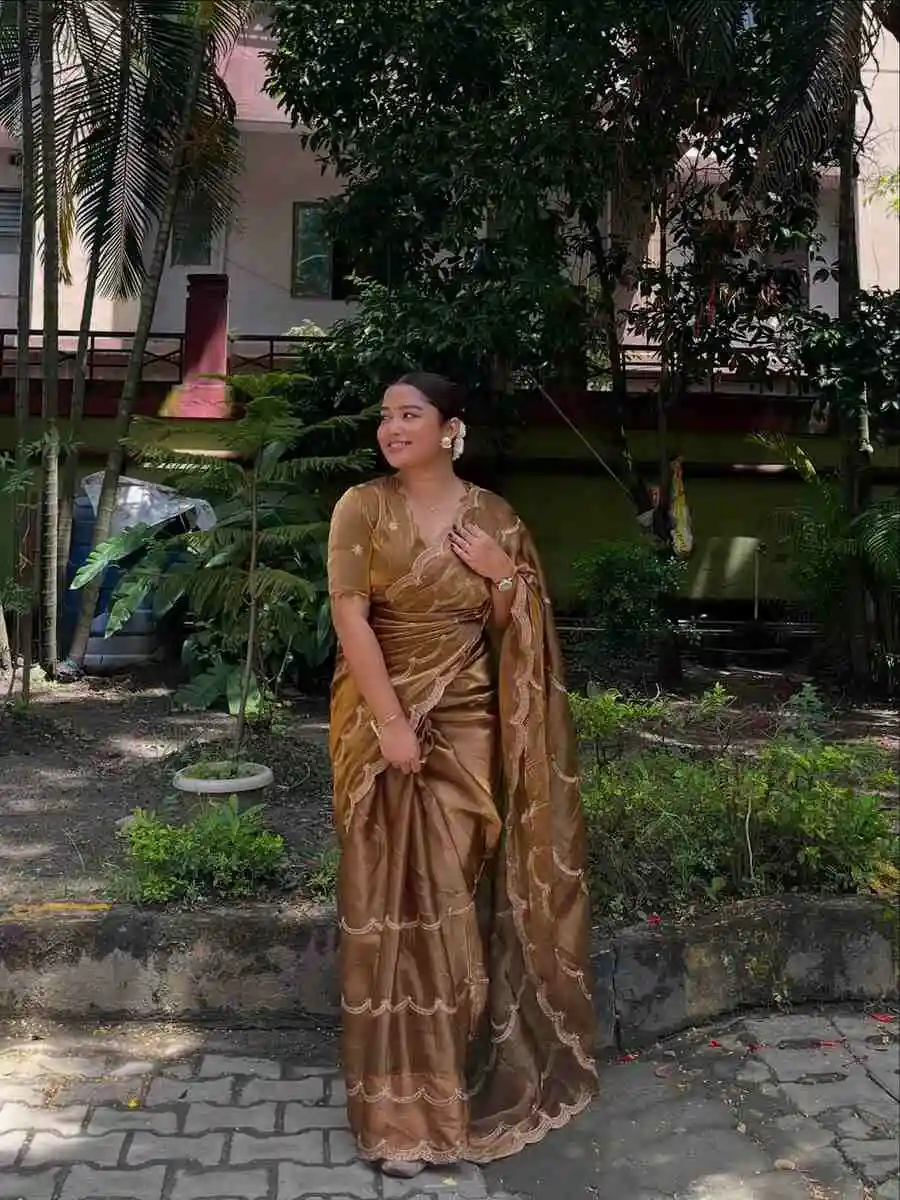 MODERN JIMMY CHOO CHIFFON SILK ZARI WORK WITH CONTRAST PALLU WORK BORDER WORK SAREE WITH UNSTITCHED BLOUSE CHIKU