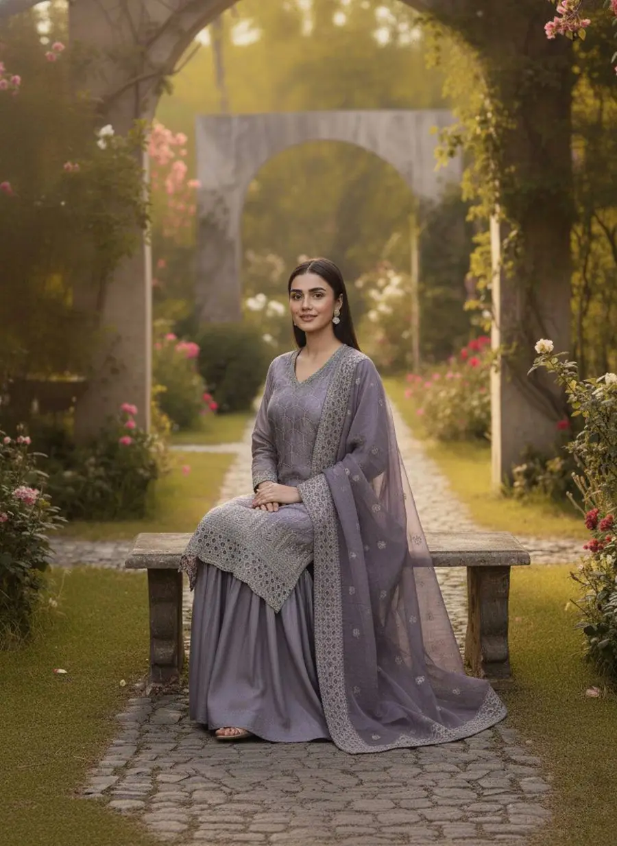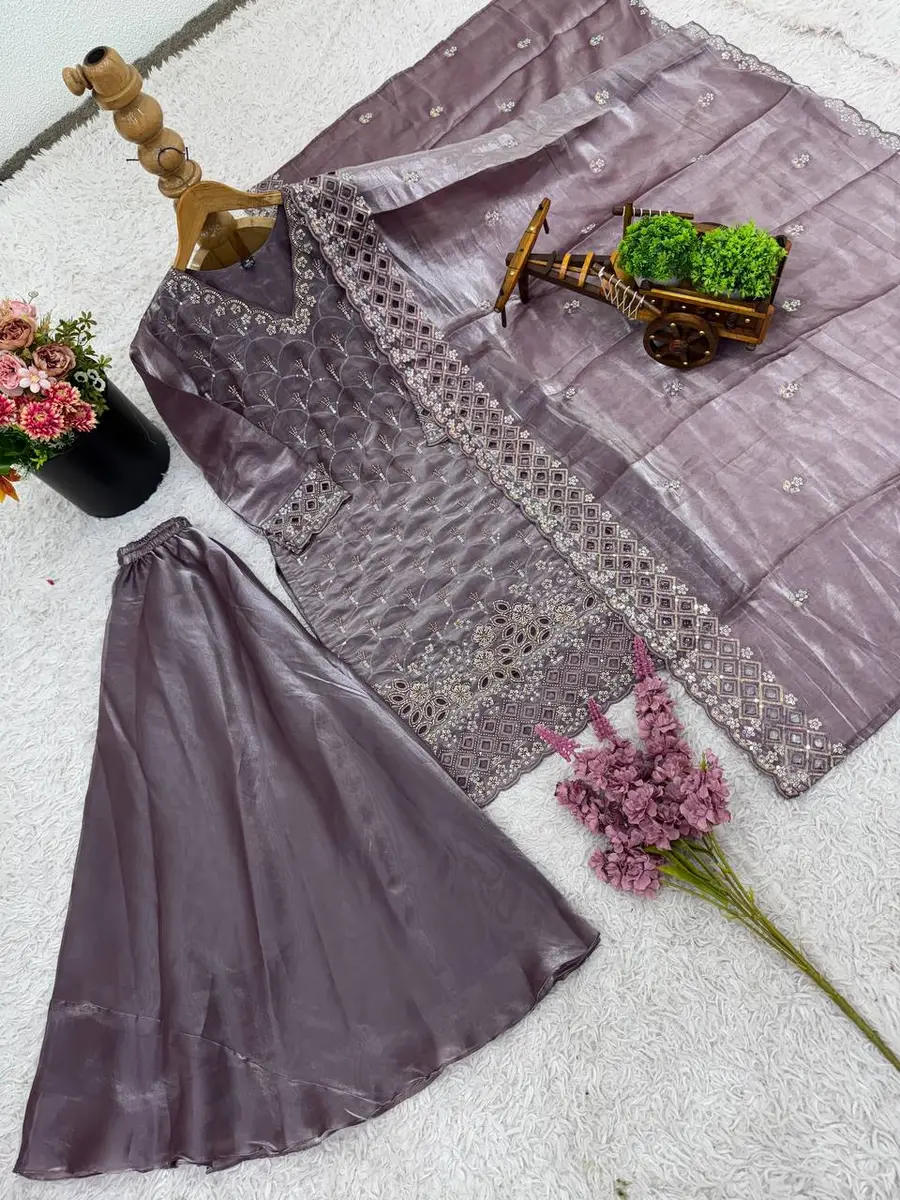 MODERN JIMMY CHOO EMBROIDERY BEADS WORK TOP PALAZZO WITH DUPATTA LAVENDER