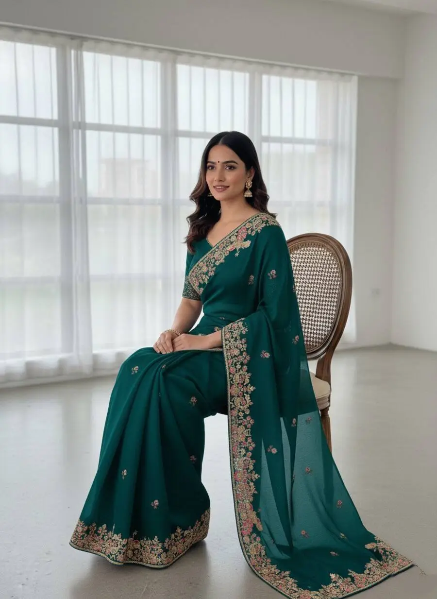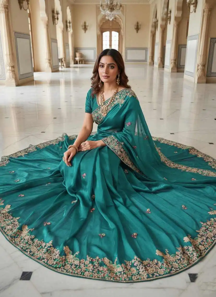 MODERN JIMMY CHOO EMBROIDERY SEQUANCE WITH CUTWORK BORDER WORK SAREE WITH UNSTITCHED BLOUSE TEAL