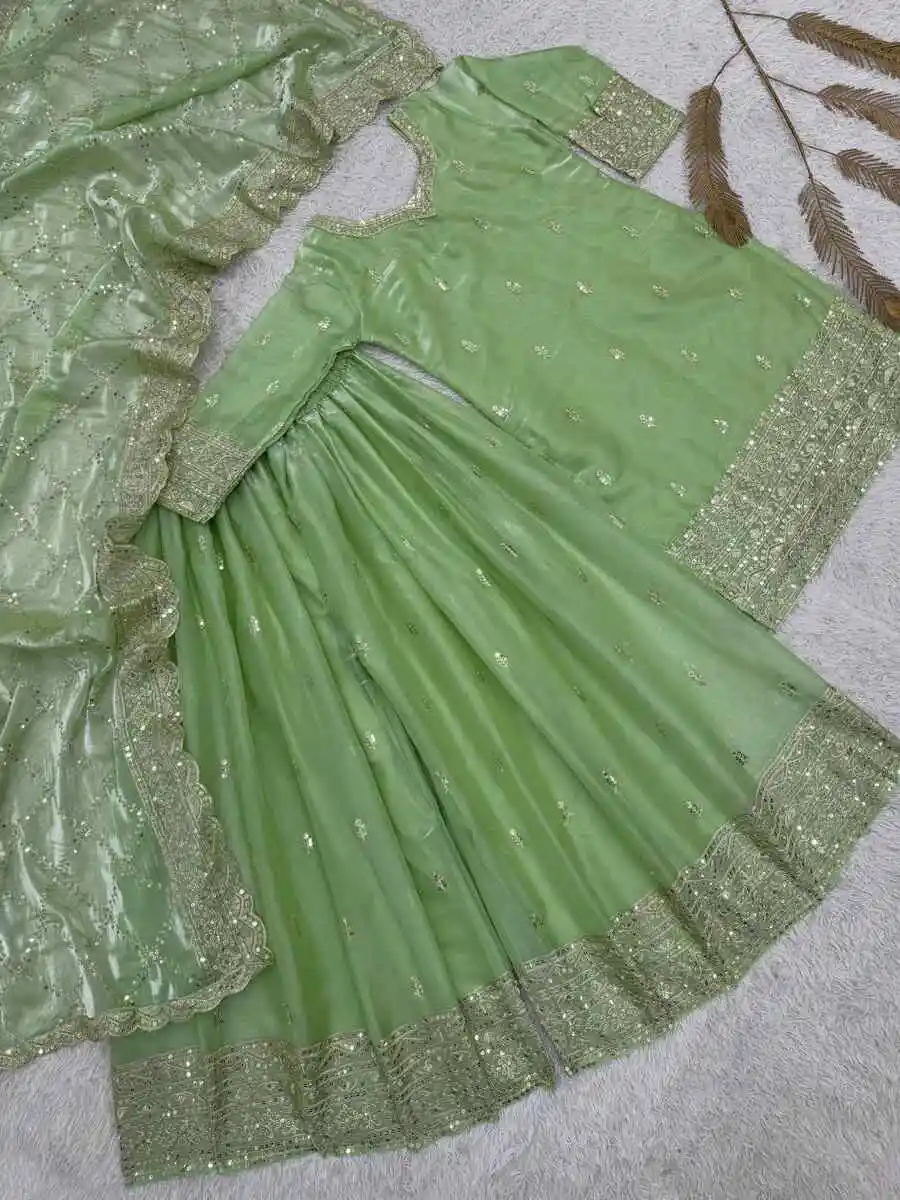 MODERN JIMMY CHOO SILK EMBROIDERY AND SEQUENCE WORK TOP PALAZZO WITH DUPATTA PISTA