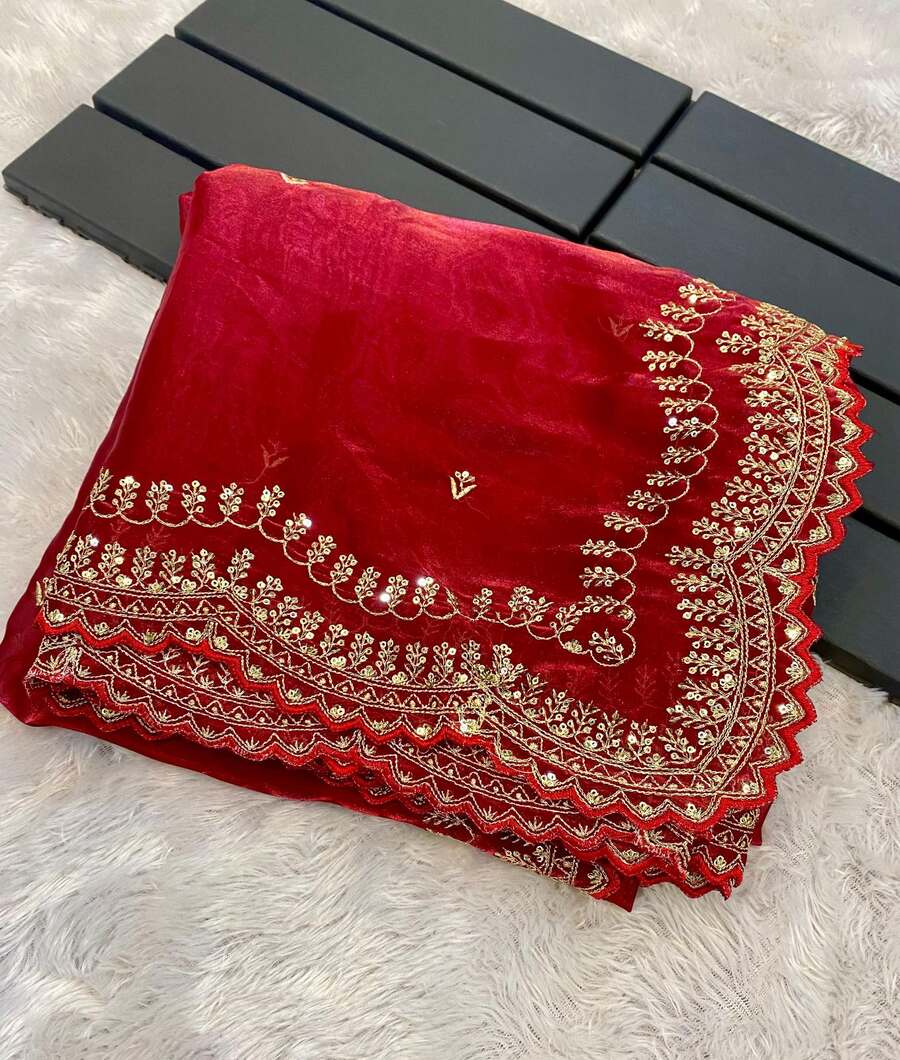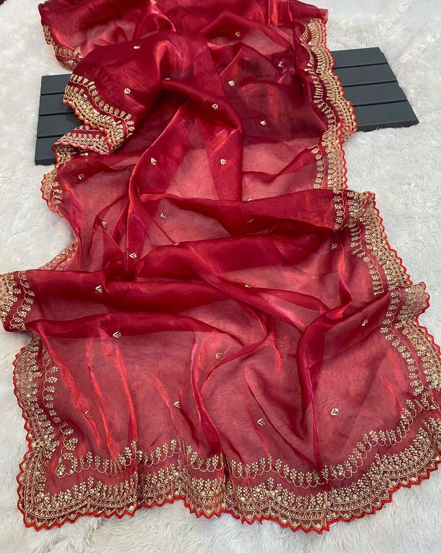 MODERN JIMMY CHOO SILK EMBROIDERY SEQUENCE AND ZARI WORK WITH CUT WORK BORDER WORK SAREE WITH STITCHED BLOUSE RED