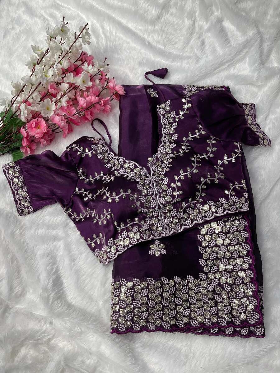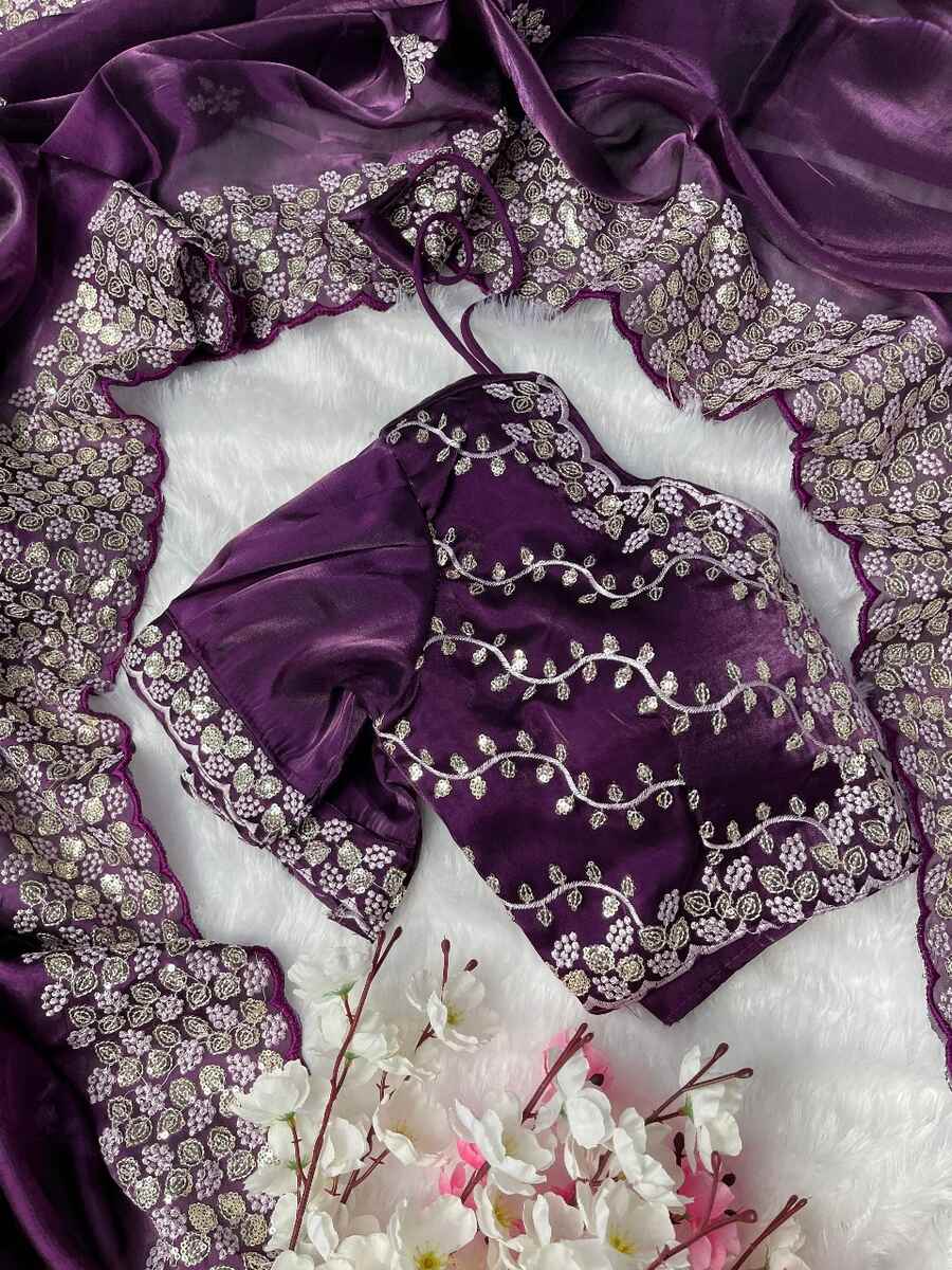 SAREE : PURE ORGANZA SILK FABRIC WITH SEQUENCE EMBROIDERY WITH BEAUTIFUL ARC CUTTING BORDER