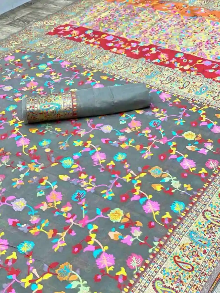 MODERN KASHMIRI PASMINA THREAD WEAVING PURE ZARI WEAVING WORK SAREE WITH UNSTITCHED BLOUSE GREY