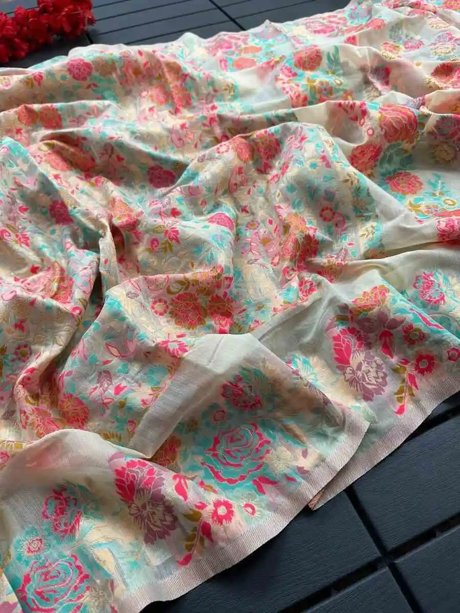 MODERN KASHMIRI PASMINA THREAD WEAVING PURE ZARI WEAVING WORK SAREE WITH UNSTITCHED BLOUSE MULTI
