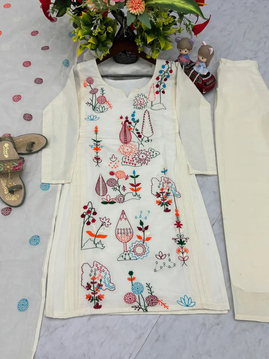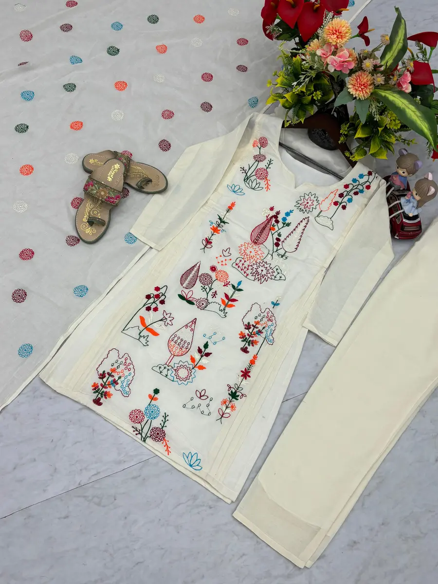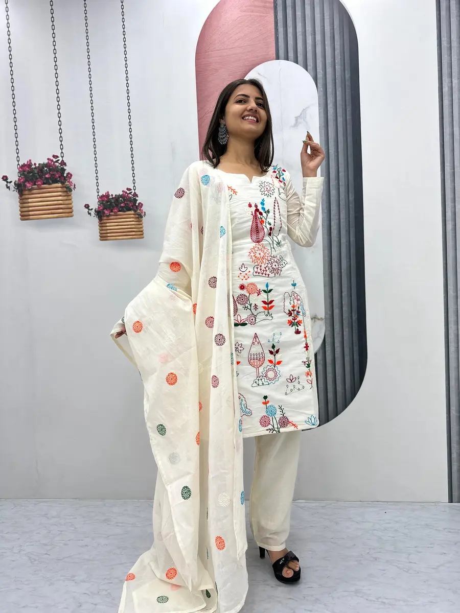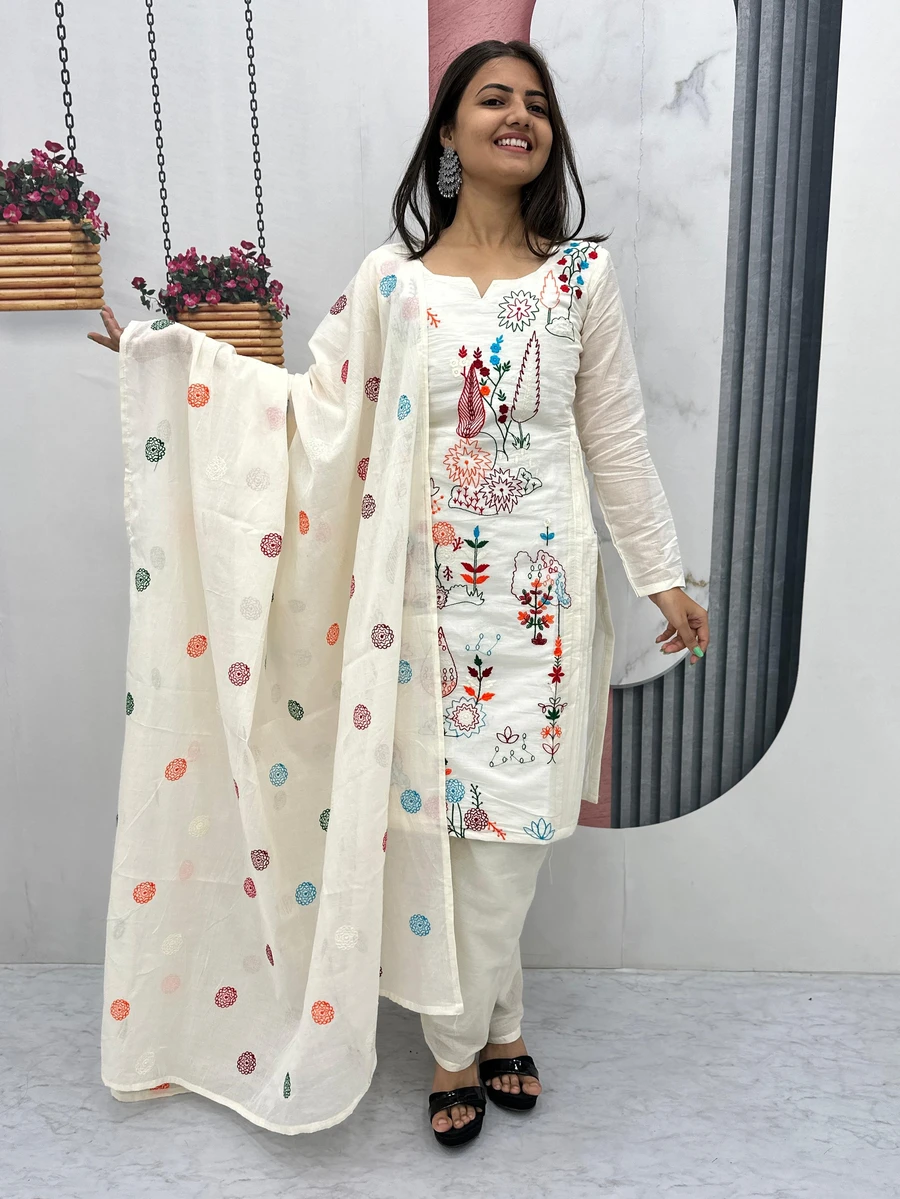 MODERN KHADI COTTON EMBROIDERY THREAD WORK TOP BOTTOM WITH DUPATTA OFF WHITE