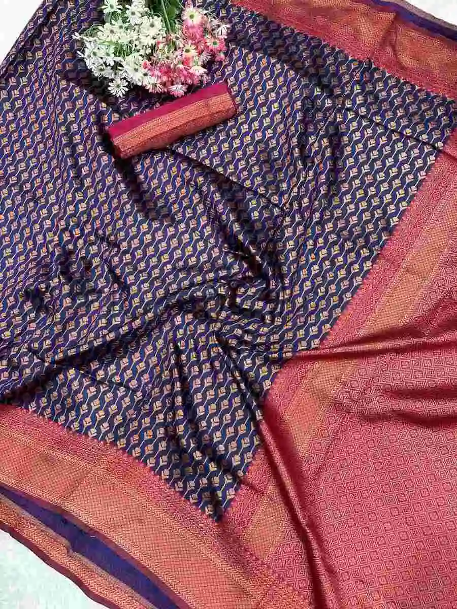 MODERN LICHI SILK BANARASI WEAVING WORK SAREE WITH UNSTITCHED BLOUSE NAVY BLUE