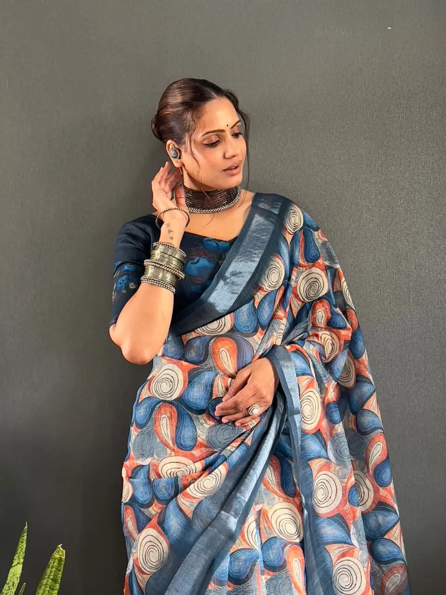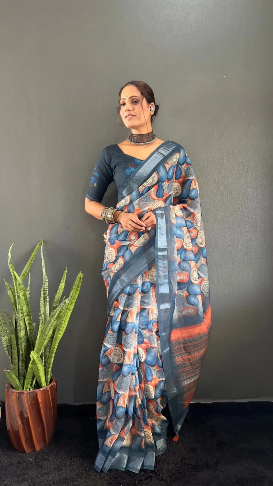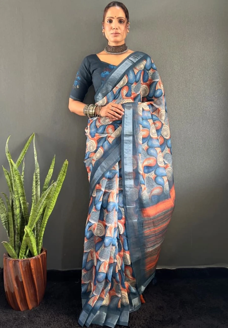 MODERN LINEN SILK DIGITAL PRINT WORK SAREE WITH UNSTITCHED BLOUSE BLUE