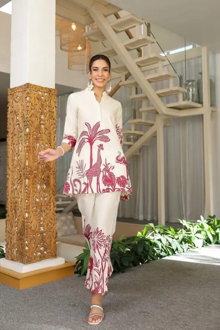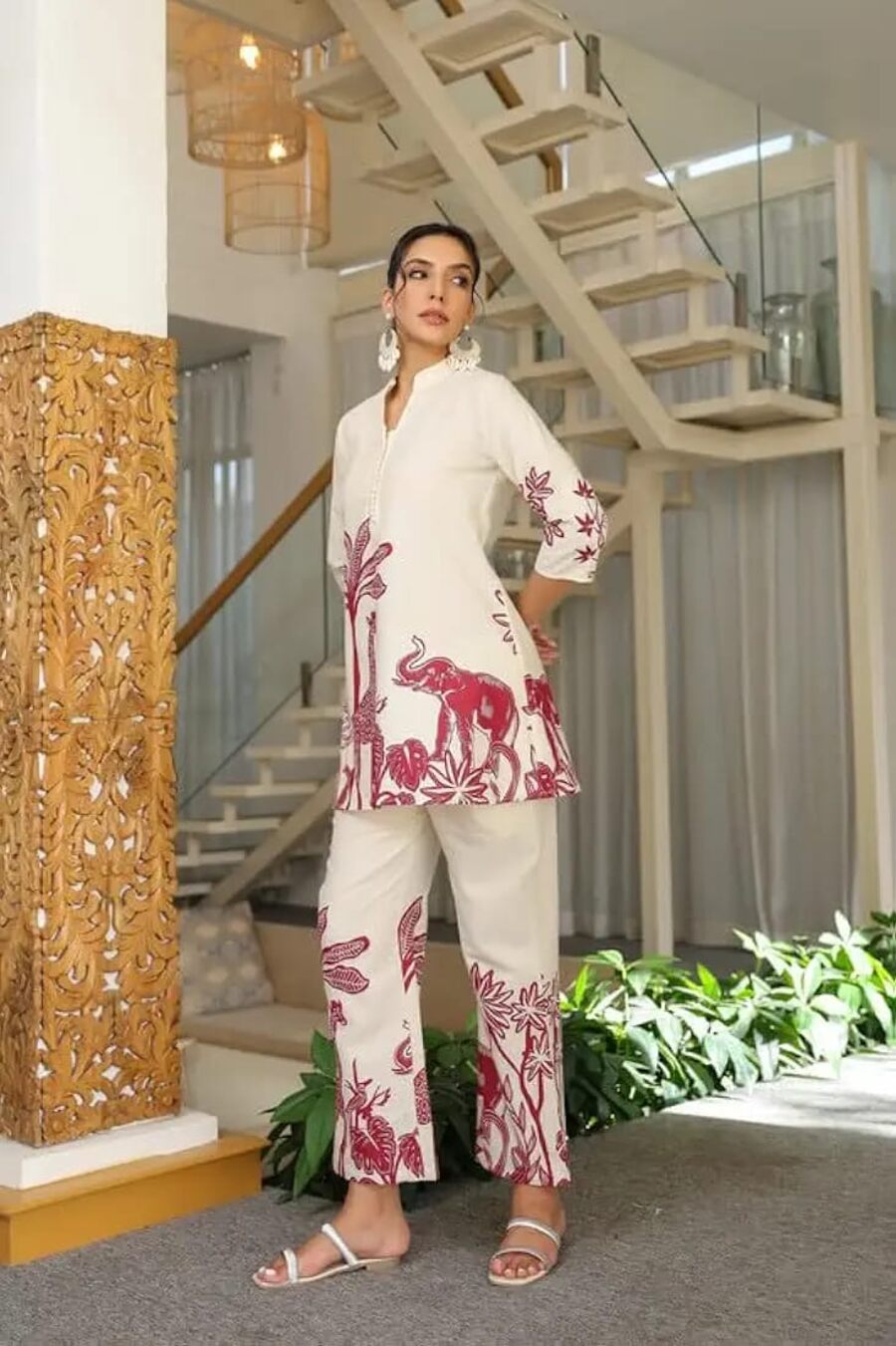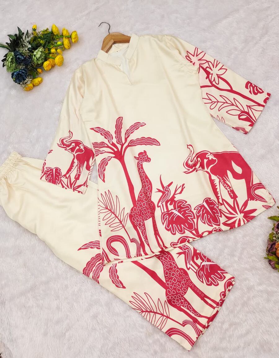 MODERN MALAI SATIN SILK DIGITAL PRINT WORK CO-ORD SET OFF WHITE