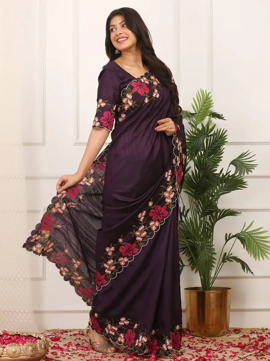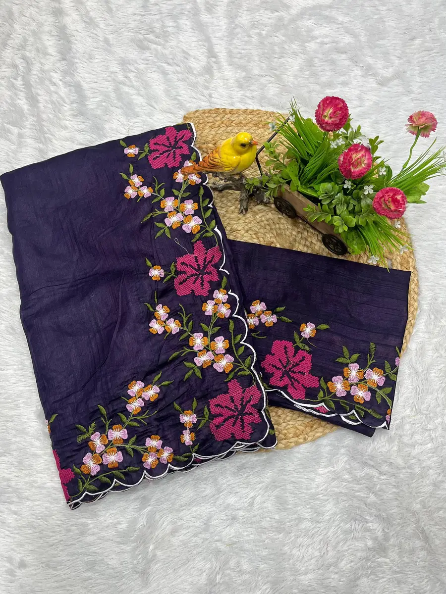 MODERN MANIPURI SILK THREAD WORK ON BORDER WITH CUTWORK SAREE WITH UNSTITCHED BLOUSE PURPLE