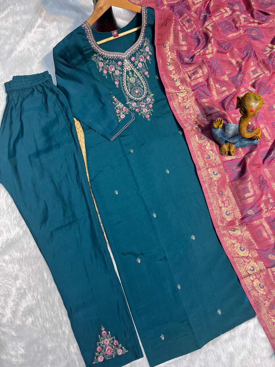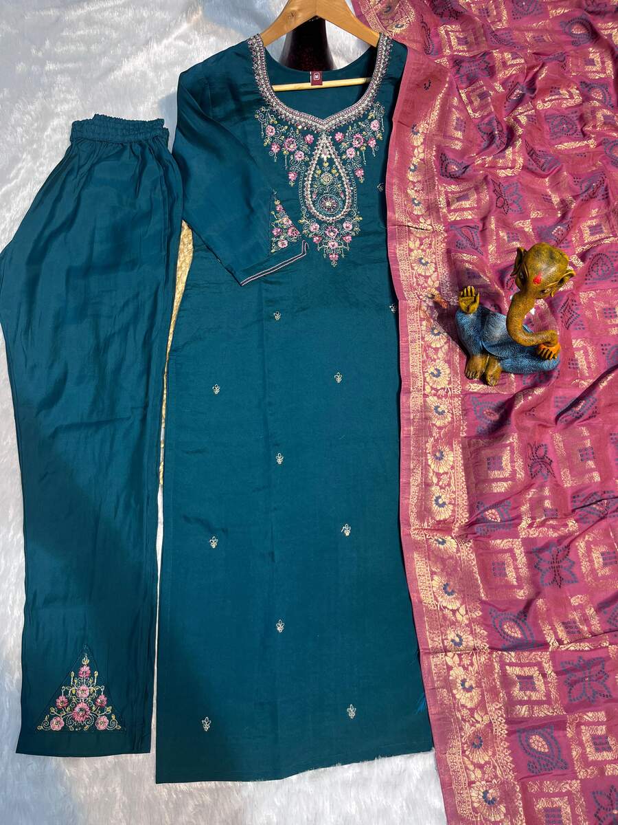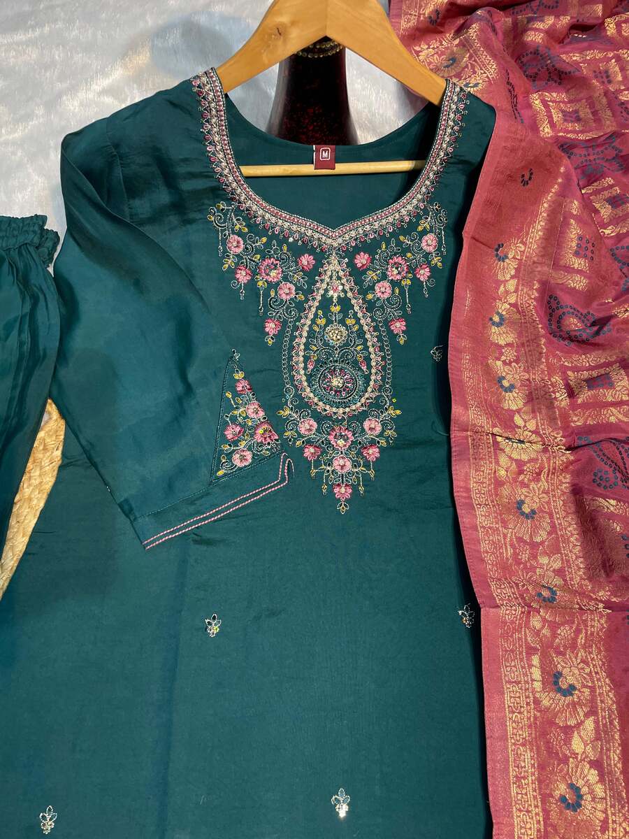 MODERN MARINA SILK MULTI EMBROIDERY THREAD, WITH HAND WORK TOP BOTTOM WITH DUPATTA RAMA