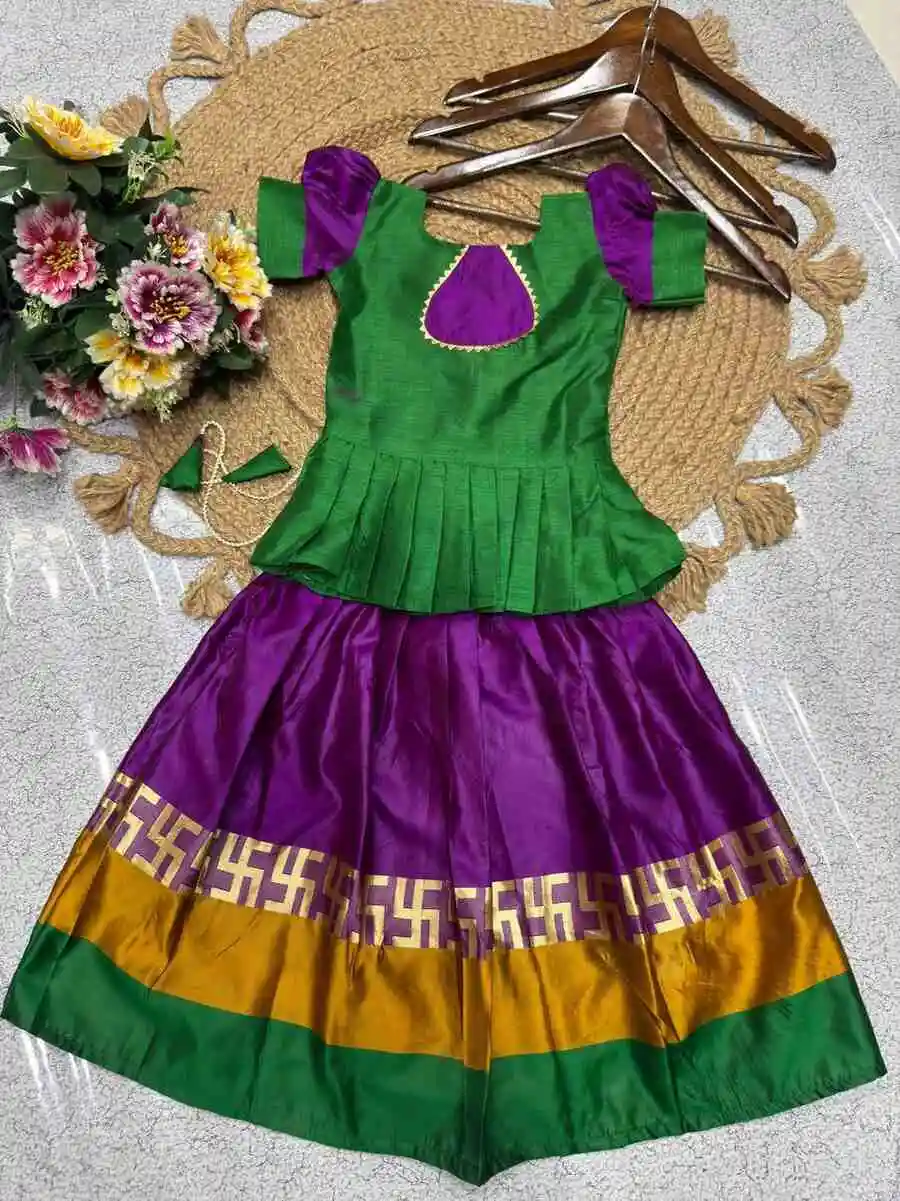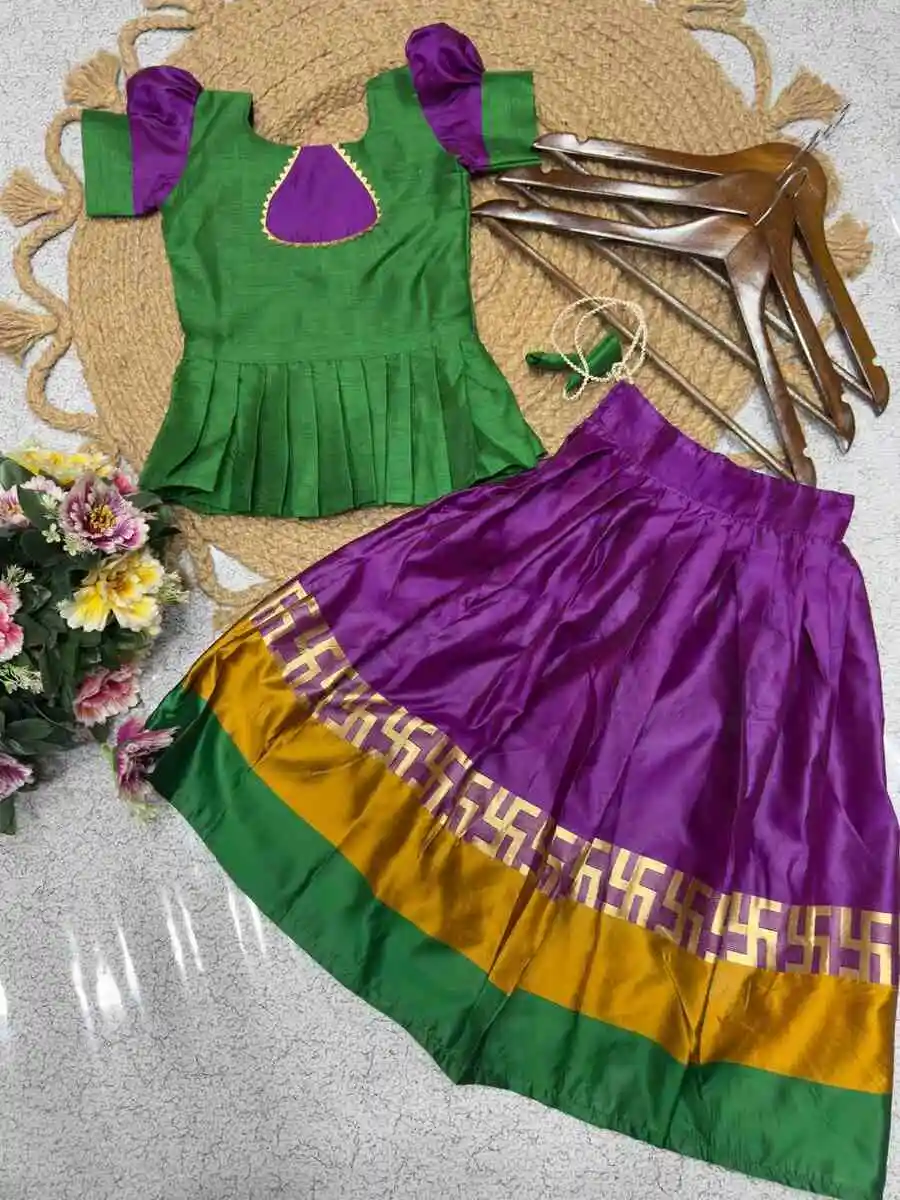 MODERN MONO SILK ZARI WEAVING JACQUARD WORK KID’S TOP LEHENGA GREEN AND PURPLE