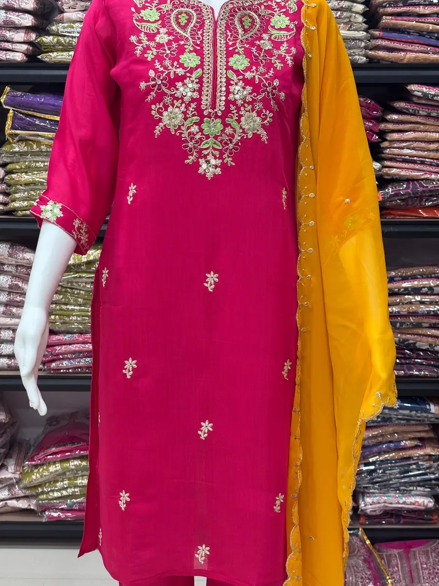 MODERN MUL CHANDERI MULTI-SEQUENCE AND CODING WORK TOP BOTTOM WITH DUPATTA PINK