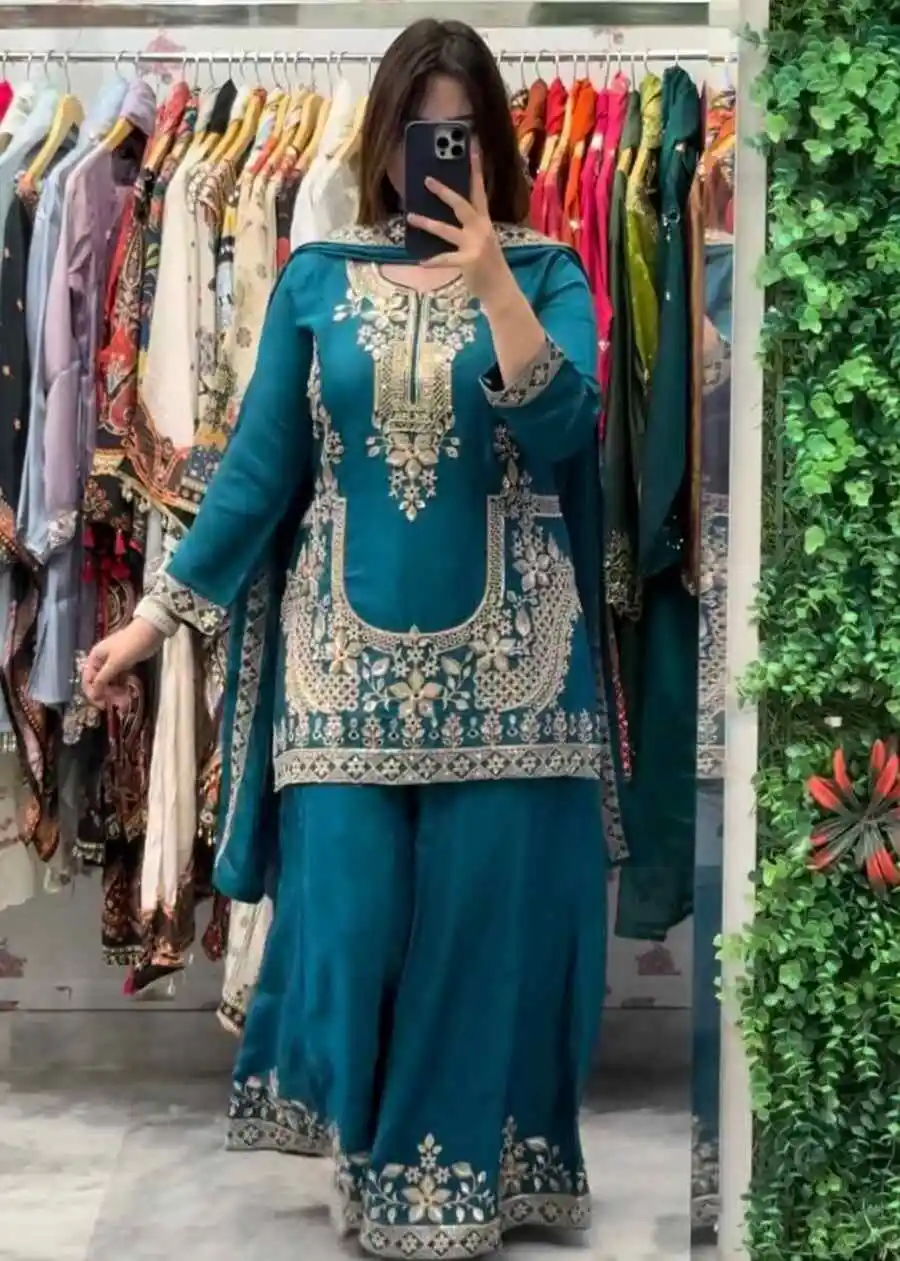 MODERN NATURAL CREPE SILK EMBROIDERY WORK WITH FANCY BORDERS LACE WORK TOP PALAZZO WITH DUPATTA TEAL