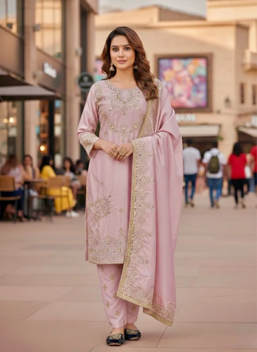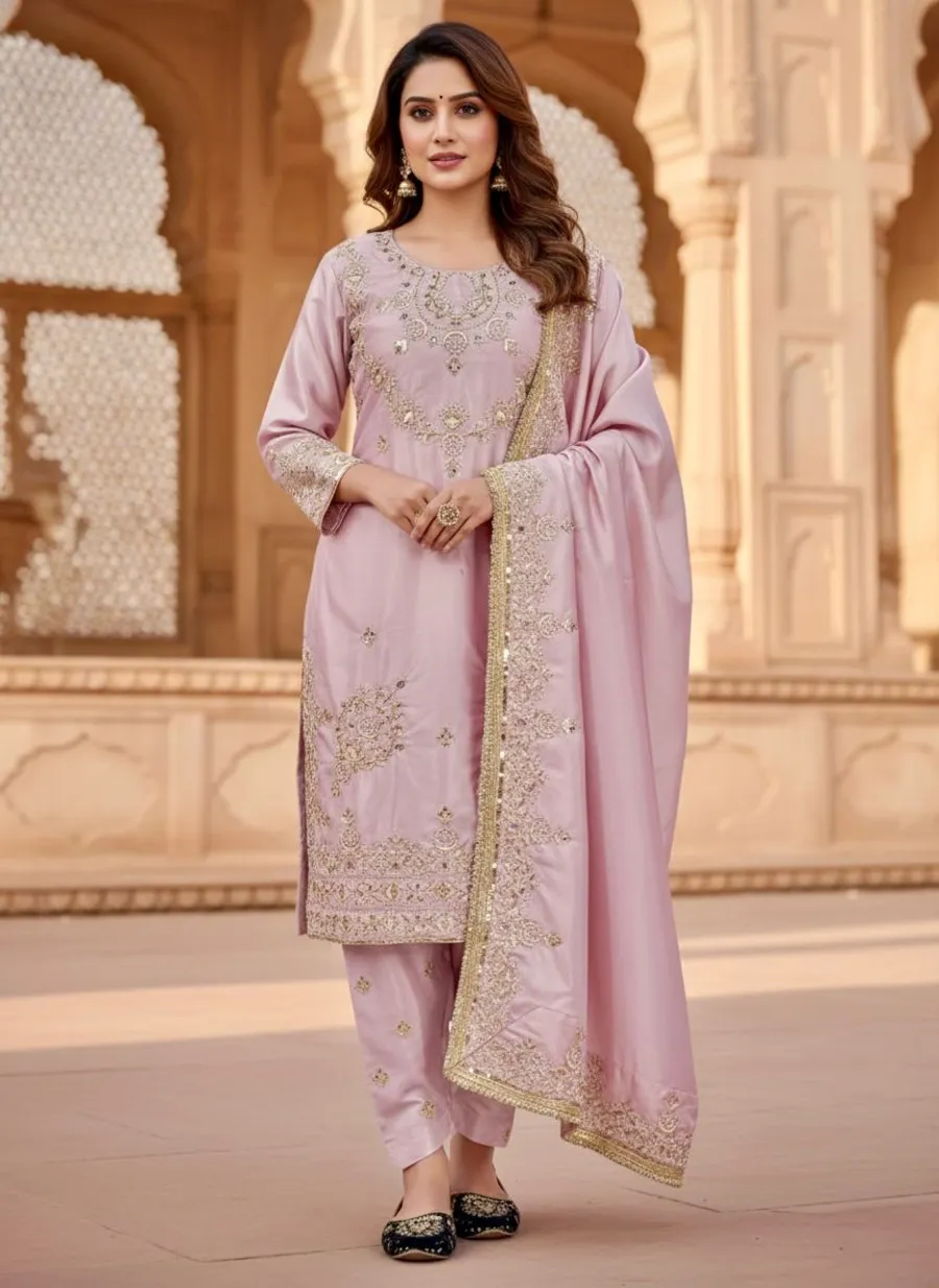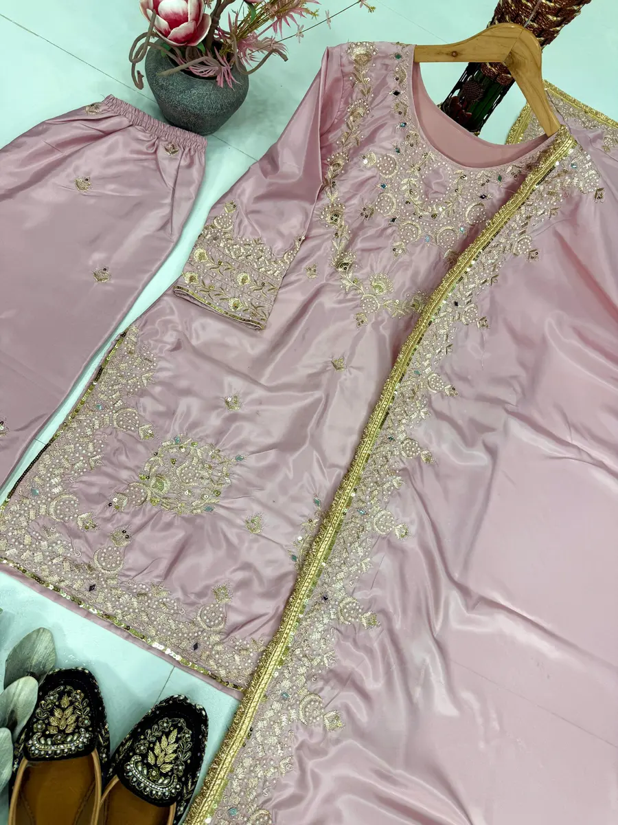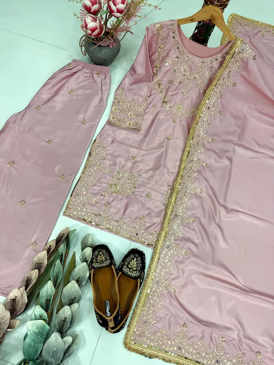MODERN NATURAL SILK EMBROIDERY SEQUENCE WORK TOP PALAZZO WITH DUPATTA BABY PINK