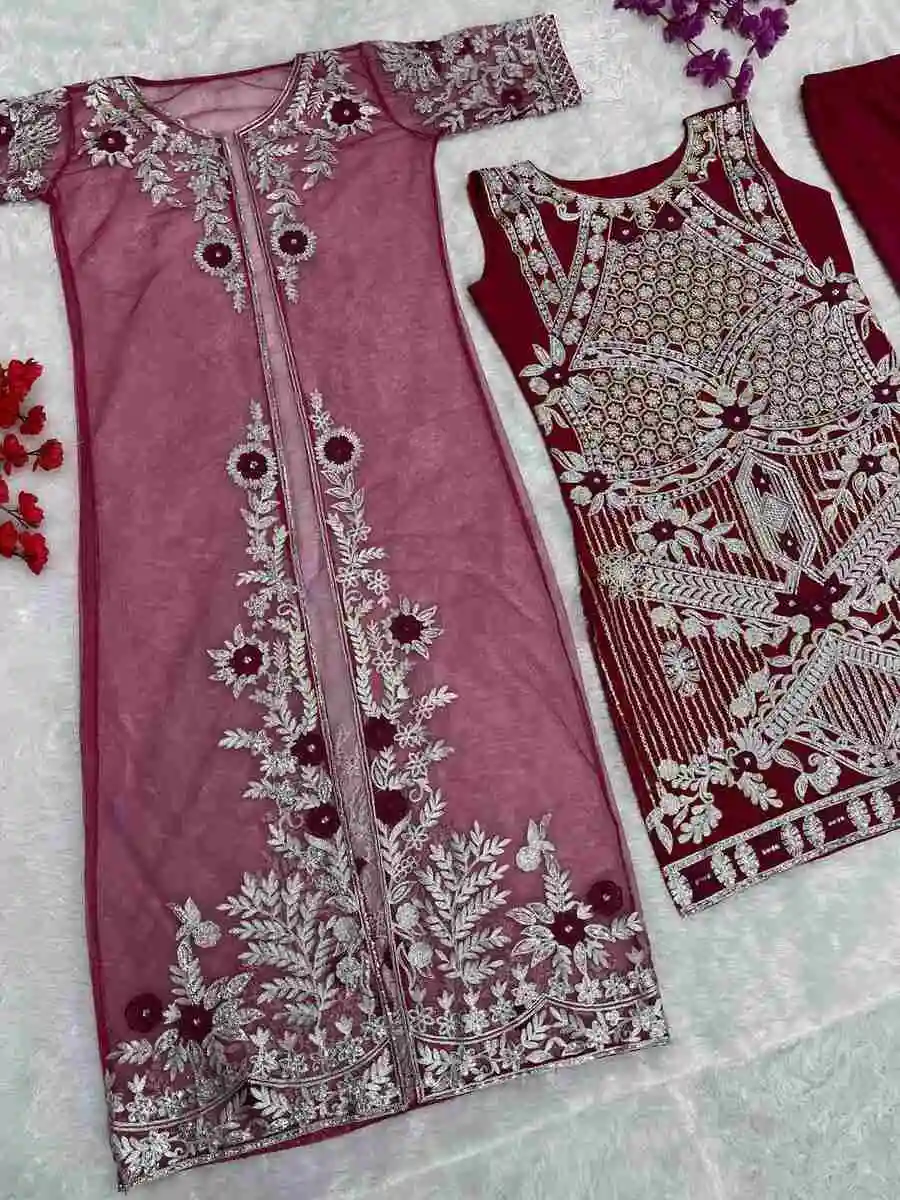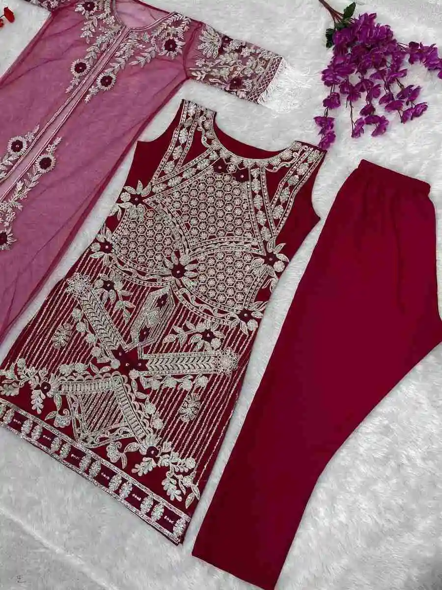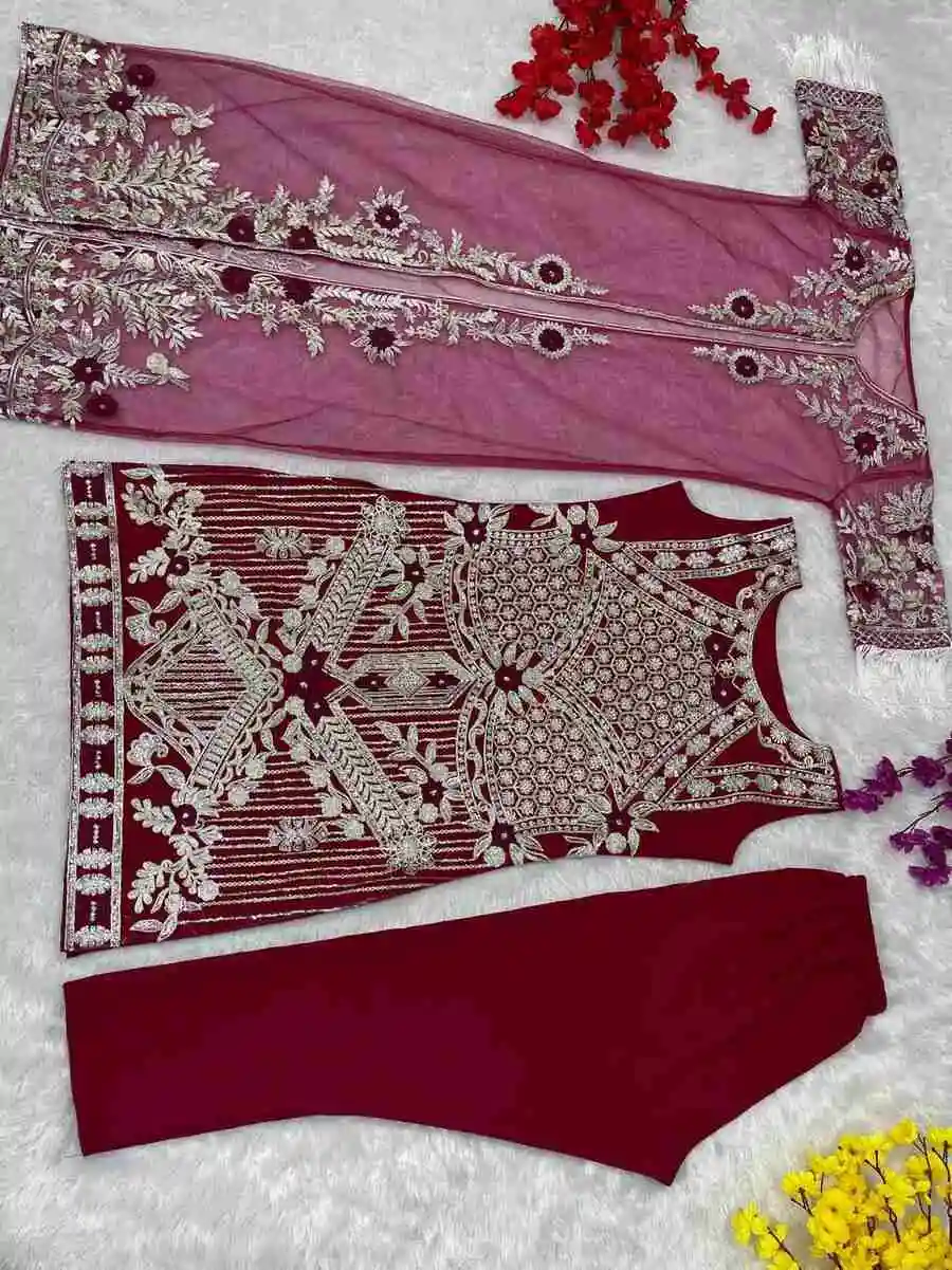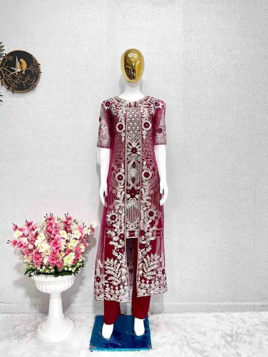 MODERN NET EMBROIDERY SEQUENCE WORK TOP BOTTOM WITH KOTI RED