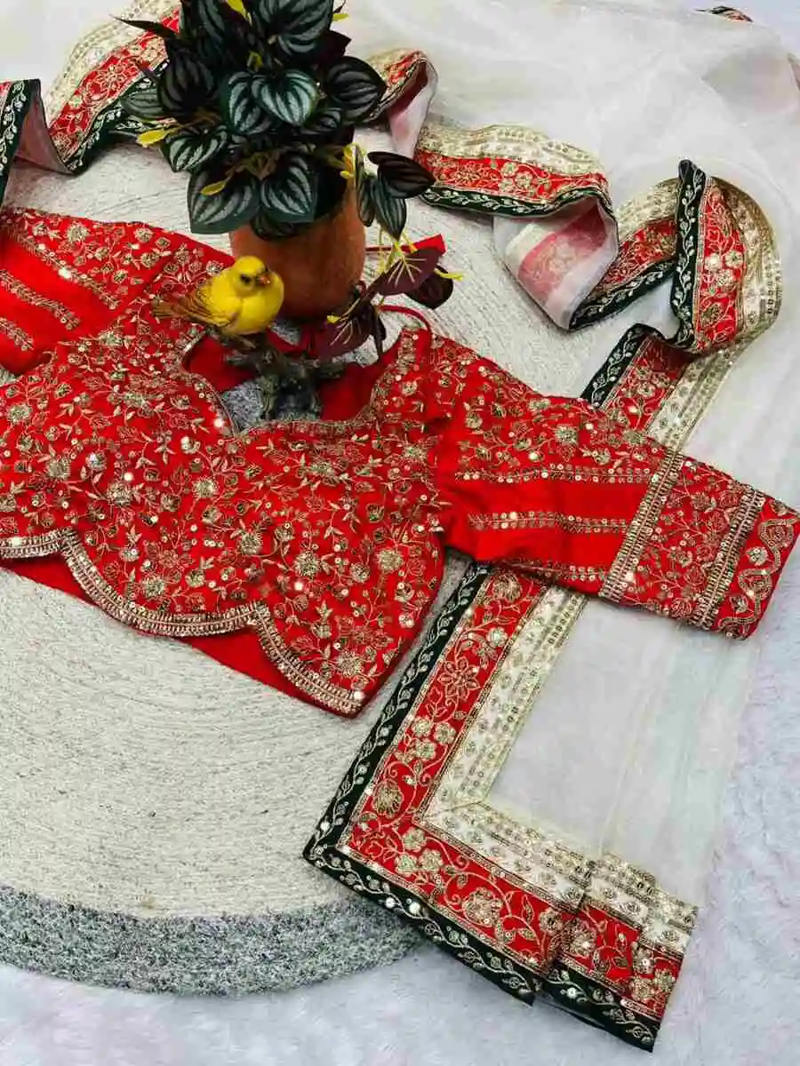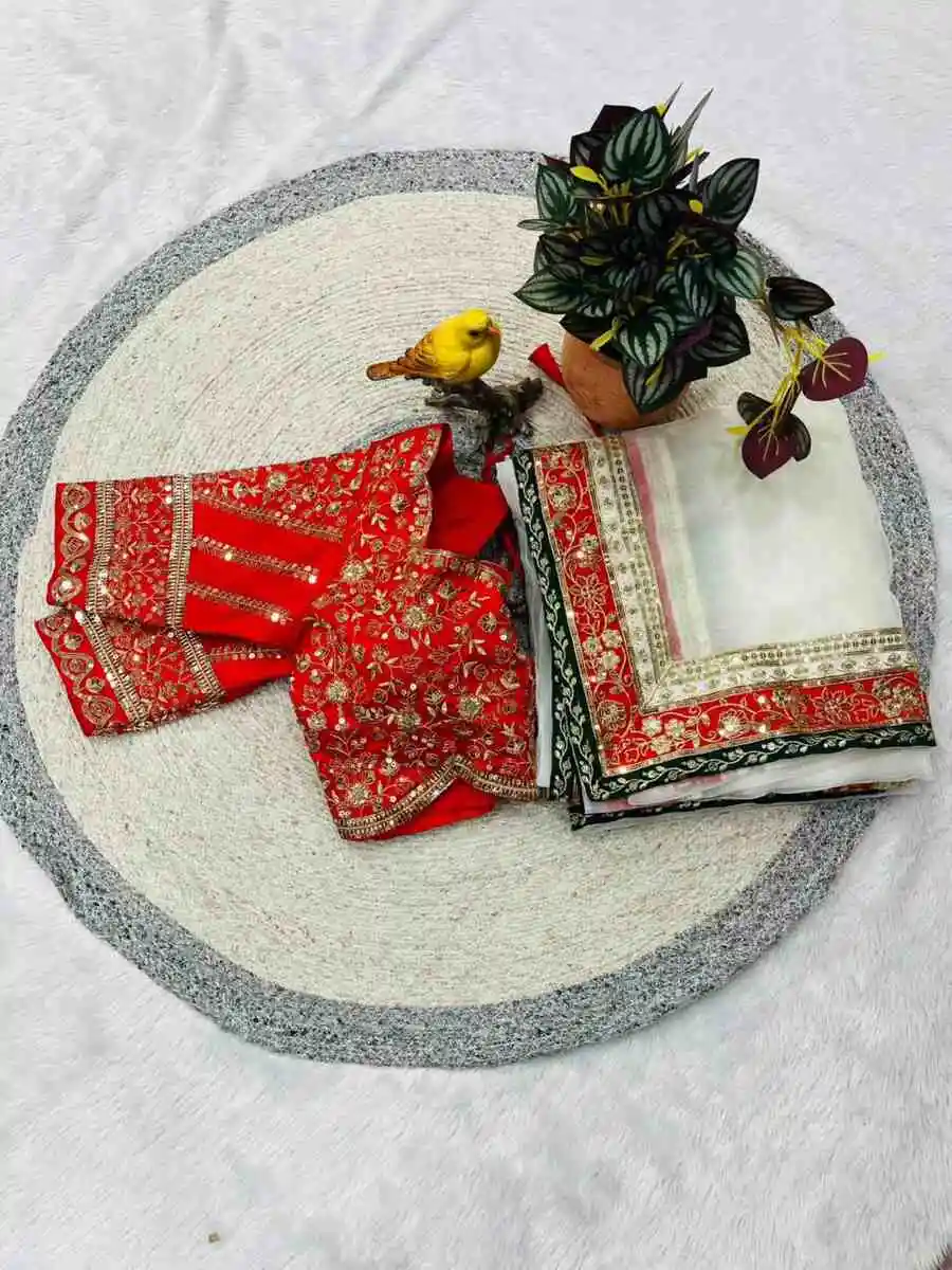 MODERN ORGANZA SILK SEQUENCE AND JARI THREAD EMBROIDERY WORK LACE BORDER WORK SAREE WITH STITCHED BLOUSE RED AND OFF WHITE