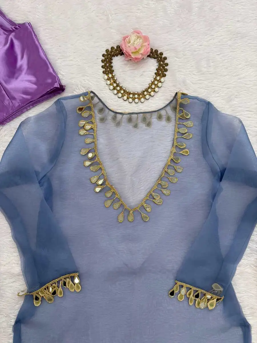 MODERN ORGANZA SILK THREAD WITH REAL MIRROR WORK TOP BOTTON AND BLOUSE PURPLE