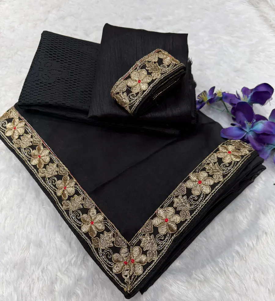 MODERN RANGOLI SILK EMBROIDERY LACE BORDER WORK SAREE WITH UNSTITCHED BLOUSE BLACK