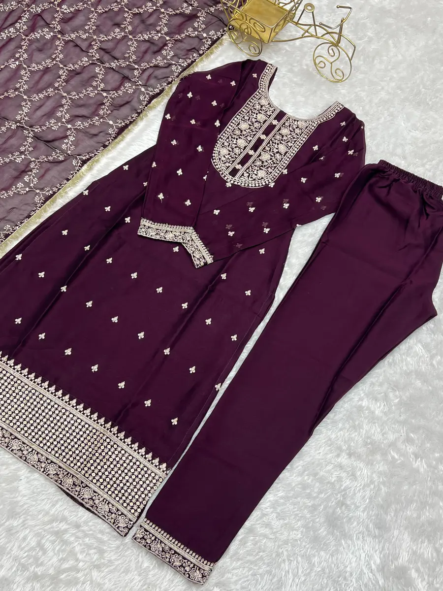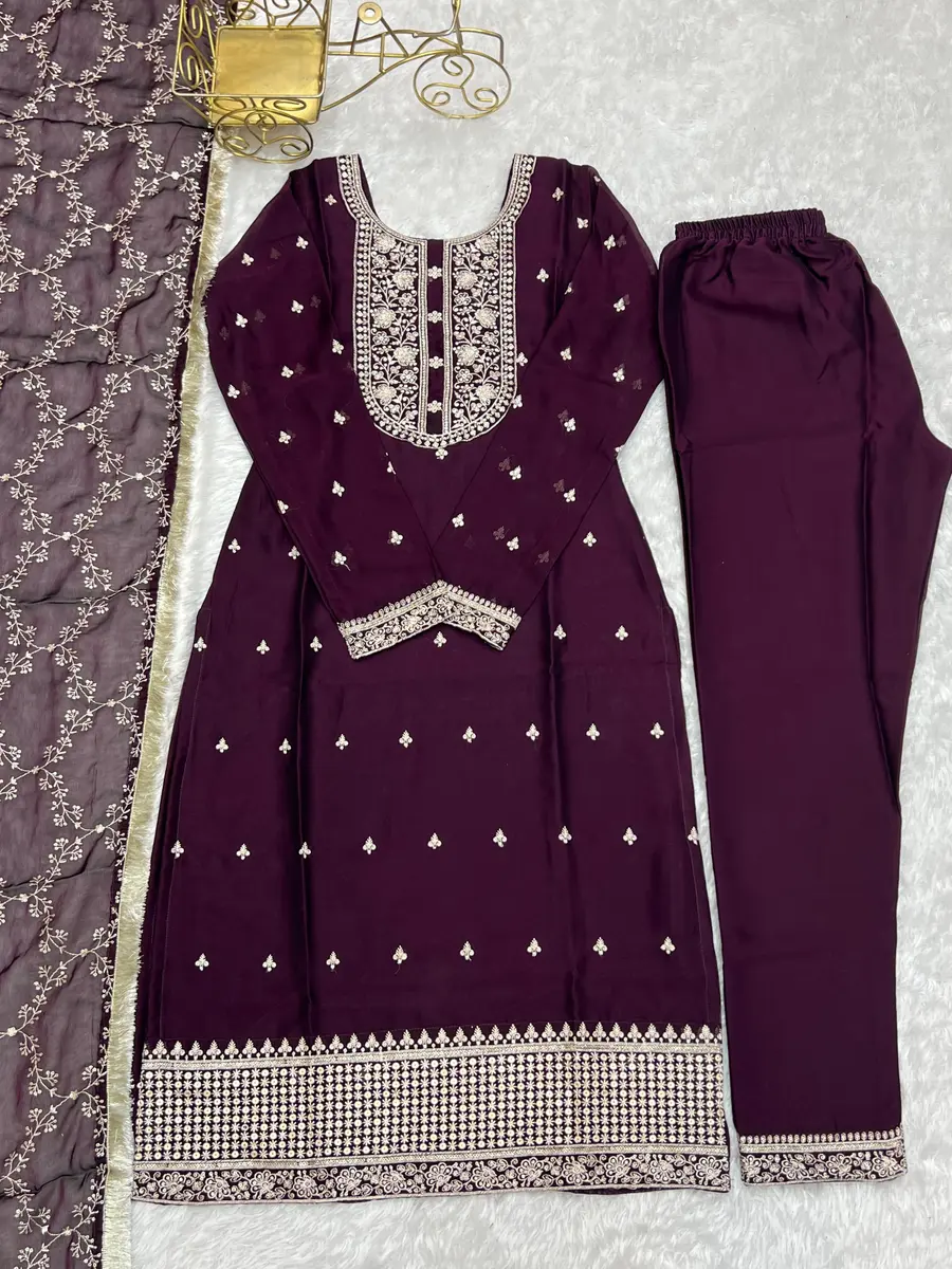 MODERN RANGOLI SILK EMBROIDERY SEQUENCE AND JARI WORK TOP BOTTOM WITH DUPATTA WINE