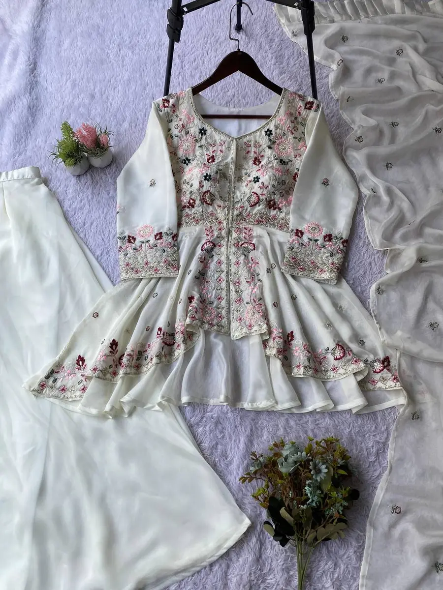 MODERN RANGOLI SILK SEQUENCE EMBROIDERY WORK TOP PALAZZO WITH DUPATTA WHITE